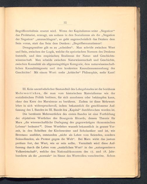 III. Kein unentbehrlicher Bestandteil des Lehrgebäudes ist die berühmteMehrwertlehre, die man vom historischen Materialismus wie dersozialistischen Politik loslösen, für sich annehmen oder bekämpfen kann,ohne den Kern des Marxismus zu berühren. Zudem ist diese Mehrwert-lehre in sich widerspruchsvoll, indem bekanntlich die geschlossene Auf-fassung des I. Bandes im III. Bande des „Kapital“ durchbrochen worden ist.