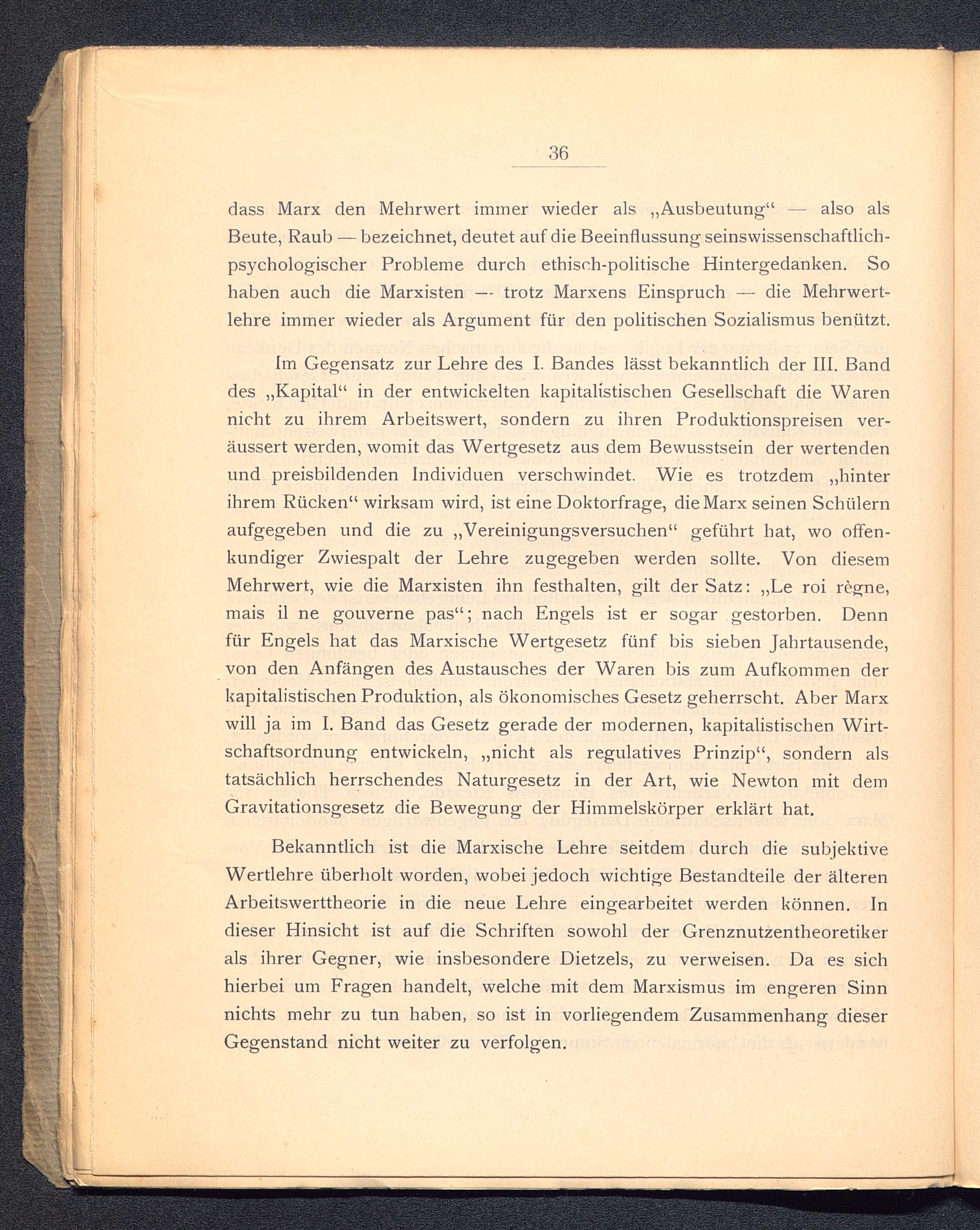 Im Gegensatz zur Lehre des I. Bandes lässt bekanntlich der III. Banddes „Kapital“ in der entwickelten kapitalistischen Gesellschaft die Warennicht zu ihrem Arbeitswert, sondern zu ihren Produktionspreisen ver-äussert werden, womit das Wertgesetz aus dem Bewusstsein der wertendenund preisbildenden Individuen verschwindet. Wie es trotzdem „hinterihrem Rücken“ wirksam wird, ist eine Doktorfrage, die Marx seinen Schülernaufgegeben und die zu „Vereinigungsversuchen“ geführt hat, wo offen-kundiger Zwiespalt der Lehre zugegeben werden sollte. Von diesemMehrwert, wie die Marxisten ihn festhalten, gilt der Satz: „Le roi regne,mais il ne gouverne pas“; nach Engels ist er sogar gestorben. Dennfür Engels hat das Marxische Wertgesetz fünf bis sieben Jahrtausende,von den Anfängen des Austausches der Waren bis zum Aufkommen derkapitalistischen Produktion, als ökonomisches Gesetz geherrscht. Aber Marxwill ja im I. Band das Gesetz gerade der modernen, kapitalistischen Wirt-schaftsordnung entwickeln, „nicht als regulatives Prinzip“, sondern alstatsächlich herrschendes Naturgesetz in der Art, wie Newton mit demGravitationsgesetz die Bewegung der Himmelskörper erklärt hat.