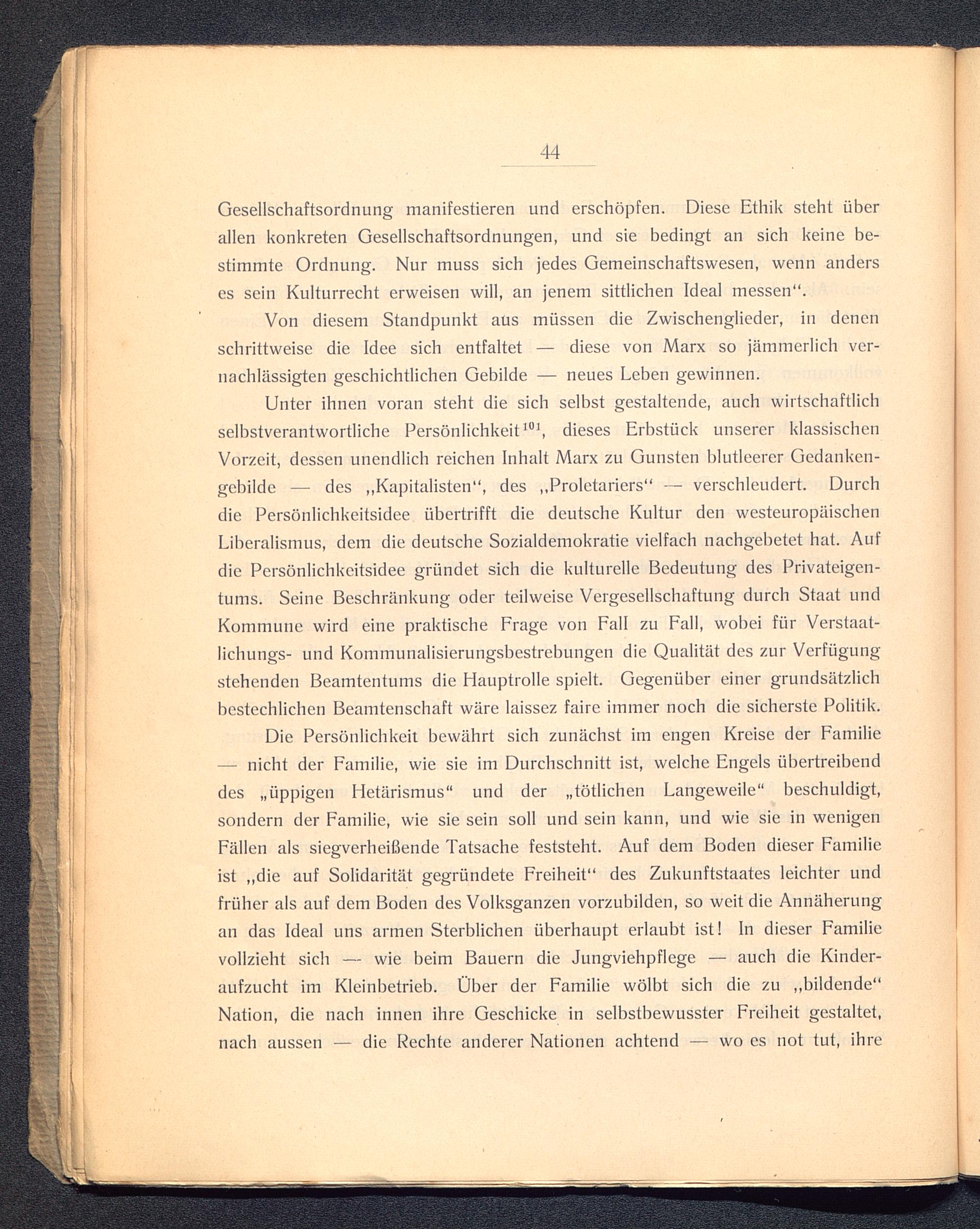 Unter ihnen voran steht die sich selbst gestaltende, auch wirtschaftlichselbstverantwortliche Persönlichkeit 101 , dieses Erbstück unserer klassischenVorzeit, dessen unendlich reichen Inhalt Marx zu Gunsten blutleerer Gedanken-gcbilde — des „Kapitalisten“, des „Proletariers“ — verschleudert. Durchdie Persönlichkeitsidee übertrifft die deutsche Kultur den westeuropäischenLiberalismus, dem die deutsche Sozialdemokratie vielfach nachgebetet hat. Aufdie Persönlichkeitsidee gründet sich die kulturelle Bedeutung des Privateigen-tums. Seine Beschränkung oder teilweise Vergesellschaftung durch Staat undKommune wird eine praktische Frage von Fall zu Fall, wobei für Verstaat-lichungs- und Kommunalisierungsbestrebungen die Qualität des zur Verfügungstehenden Beamtentums die Hauptrolle spielt. Gegenüber einer grundsätzlichbestechlichen Beamtenschaft wäre laissez faire immer noch die sicherste Politik.