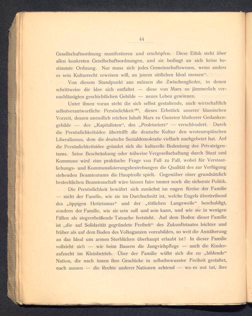 Die Persönlichkeit bewährt sich zunächst im engen Kreise der Familie— nicht der Familie, wie sie im Durchschnitt ist, welche Engels übertreibenddes „üppigen Hetärismus“ und der „tötlichen Langeweile“ beschuldigt,sondern der Familie, wie sie sein soll und sein kann, und wie sie in wenigenFällen als siegverheißende Tatsache feststeht. Auf dem Boden dieser Familieist „die auf Solidarität gegründete Freiheit“ des Zukunftstaates leichter undfrüher als auf dem Boden des Volksganzen vorzubilden, so weit die Annäherungan das Ideal uns armen Sterblichen überhaupt erlaubt ist! In dieser Familievollzieht sich — wie beim Bauern die Jungviehpflege — auch die Kinder-aufzucht im Kleinbetrieb. Über der Familie wölbt sich die zu „bildende“Nation, die nach innen ihre Geschicke in selbstbewusster Freiheit gestaltet,nach aussen — die Rechte anderer Nationen achtend — wo es not tut, ihre