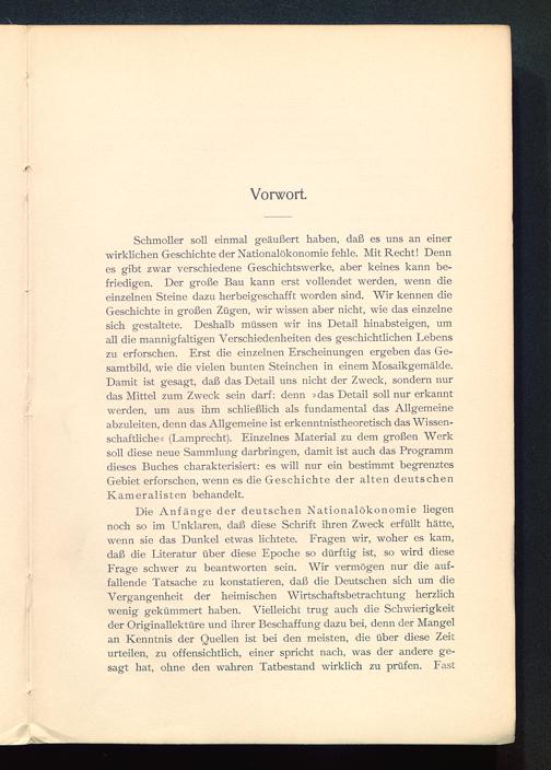 Schmoller soll einmal geäußert haben, daß es uns an einerwirklichen Geschichte der Nationalökonomie fehle. Mit Recht! Dennes gibt zwar verschiedene Geschichtswerke, aber keines kann be-friedigen. Der große Bau kann erst vollendet werden, wenn dieeinzelnen Steine dazu herbeigeschafft worden sind. Wir kennen dieGeschichte in großen Zügen, wir wissen aber nicht, wie das einzelnesich gestaltete. Deshalb müssen wir ins Detail hinabsteigen, umall die mannigfaltigen Verschiedenheiten des geschichtlichen Lebenszu erforschen. Erst die einzelnen Erscheinungen ergeben das Ge-samtbild, wie die vielen bunten Steinchen in einem Mosaikgemälde.Damit ist gesagt, daß das Detail uns nicht der Zweck, sondern nurdas Mittel zum Zweck sein darf: denn »das Detail soll nur erkanntwerden, um aus ihm schließlich als fundamental das Allgemeineabzuleiten, denn das Allgemeine ist erkenntnistheoretisch das Wissen-schaftliche« (Lamprecht). Einzelnes Material zu dem großen Werksoll diese neue Sammlung darbringen, damit ist auch das Programmdieses Buches charakterisiert: es will nur ein bestimmt begrenztesGebiet erforschen, wenn es die Geschichte der alten deutschenKameralisten behandelt.