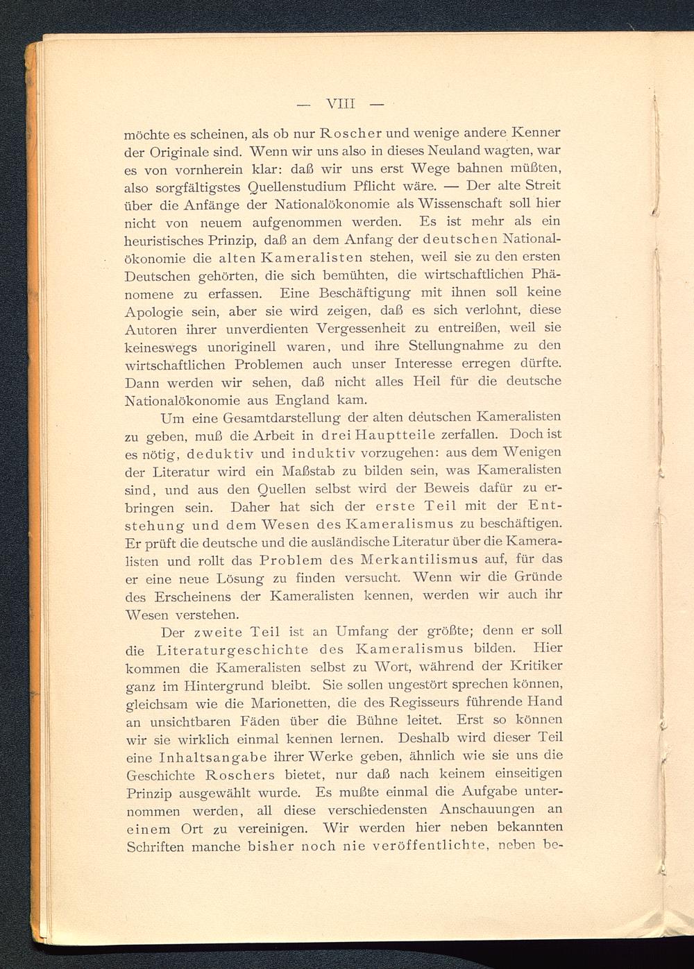 Der zweite Teil ist an Umfang der größte; denn er solldie Literaturgeschichte des Kameralismus bilden. Hierkommen die Kameralisten selbst zu Wort, während der Kritikerganz im Hintergrund bleibt. Sie sollen ungestört sprechen können,gleichsam wie die Marionetten, die des Regisseurs führende Handan unsichtbaren Fäden über die Bühne leitet. Erst so könnenwir sie wirklich einmal kennen lernen. Deshalb wird dieser Teileine Inhaltsangabe ihrer Werke geben, ähnlich wie sie uns dieGeschichte Roschers bietet, nur daß nach keinem einseitigenPrinzip ausgewählt wurde. Es mußte einmal die Aufgabe unter-nommen werden, all diese verschiedensten Anschauungen aneinem Ort zu vereinigen. Wir werden hier neben bekanntenSchriften manche bisher noch nie veröffentlichte, neben be-