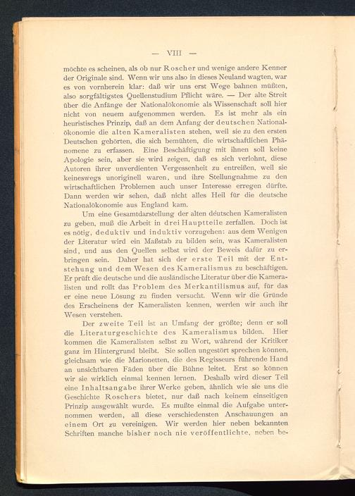 Um eine Gesamtdarstellung der alten deutschen Kameralistenzu geben, muß die Arbeit in drei Hauptteile zerfallen. Doch istes nötig, deduktiv und induktiv vorzugehen: aus dem Wenigender Literatur wird ein Maßstab zu bilden sein, was Kameralistensind, und aus den Quellen selbst wird der Beweis dafür zu er-bringen sein. Daher hat sich der erste Teil mit der Ent-stehung und dem Wesen des Kameralismus zu beschäftigen.Er prüft die deutsche und die ausländische Literatur über die Kamera-listen und rollt das Problem des Merkantilismus auf, für daser eine neue Lösung zu finden versucht. Wenn wir die Gründedes Erscheinens der Kameralisten kennen, werden wir auch ihrWesen verstehen.