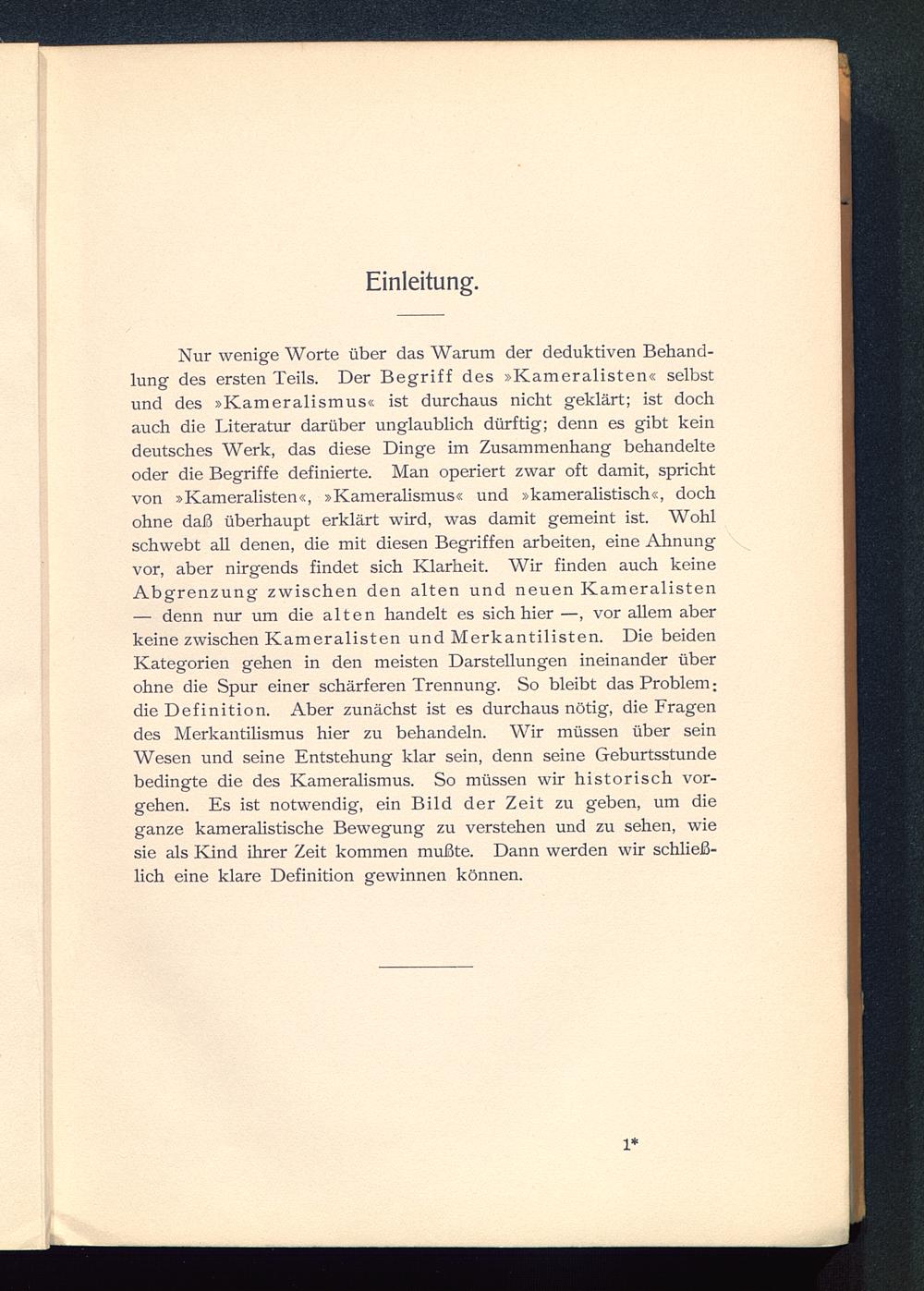 Nur wenige Worte über das Warum der deduktiven Behand-lung des ersten Teils. Der Begriff des »Kameralisten« selbstund des »Kameralismus« ist durchaus nicht geklärt; ist dochauch die Literatur darüber unglaublich dürftig; denn es gibt keindeutsches Werk, das diese Dinge im Zusammenhang behandelteoder die Begriffe definierte. Man operiert zwar oft damit, sprichtvon »Kameralisten«, »Kameralismus« und »kameralistisch«, dochohne daß überhaupt erklärt wird, was damit gemeint ist. Wohlschwebt all denen, die mit diesen Begriffen arbeiten, eine Ahnungvor, aber nirgends findet sich Klarheit. Wir finden auch keineAbgrenzung zwischen den alten und neuen Kameralisten— denn nur um die alten handelt es sich hier —, vor allem aberkeine zwischen Kameralisten und Merkantilisten. Die beidenKategorien gehen in den meisten Darstellungen ineinander überohne die Spur einer schärferen Trennung. So bleibt das Problem;die Definition. Aber zunächst ist es durchaus nötig, die Fragendes Merkantilismus hier zu behandeln. Wir müssen über seinWesen und seine Entstehung klar sein, denn seine Geburtsstundebedingte die des Kameralismus. So müssen wir historisch Vor-gehen. Es ist notwendig, ein Bild der Zeit zu geben, um dieganze kameralistische Bewegung zu verstehen und zu sehen, wiesie als Kind ihrer Zeit kommen mußte. Dann werden wir schließ-lich eine klare Definition gewinnen können.