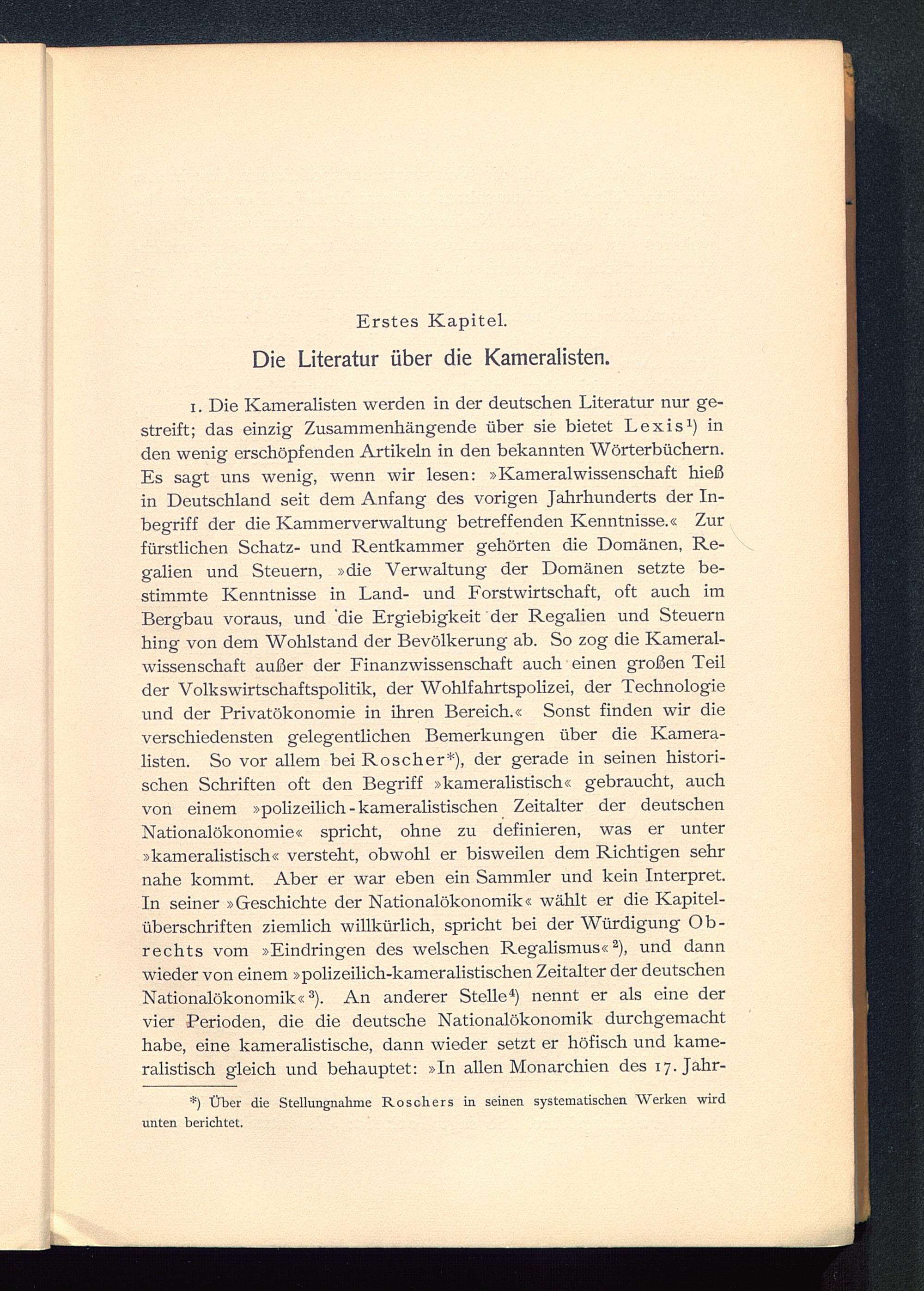 i. Die Kameralisten werden in der deutschen Literatur nur ge-streift; das einzig Zusammenhängende über sie bietet Lexis 1 ) inden wenig erschöpfenden Artikeln in den bekannten Wörterbüchern.Es sagt uns wenig, wenn wir lesen: »Kameralwissenschaft hießin Deutschland seit dem Anfang des vorigen Jahrhunderts der In-begriff der die Kammerverwaltung betreffenden Kenntnisse.« Zurfürstlichen Schatz- und Rentkammer gehörten die Domänen, Re-galien und Steuern, »die Verwaltung der Domänen setzte be-stimmte Kenntnisse in Land- und Forstwirtschaft, oft auch imBergbau voraus, und 'die Ergiebigkeit der Regalien und Steuernhing von dem Wohlstand der Bevölkerung ab. So zog die Kameral-wissenschaft außer der Finanzwissenschaft auch einen großen Teilder Volkswirtschaftspolitik, der Wohlfahrtspolizei, der Technologieund der Privatökonomie in ihren Bereich.« Sonst finden wir dieverschiedensten gelegentlichen Bemerkungen über die Kamera-listen. So vor allem bei Roscher*), der gerade in seinen histori-schen Schriften oft den Begriff »kameralistisch« gebraucht, auchvon einem »polizeilich - kameralistischen Zeitalter der deutschenNationalökonomie« spricht, ohne zu definieren, was er unter»kameralistisch« versteht, obwohl er bisweilen dem Richtigen sehrnahe kommt. Aber er war eben ein Sammler und kein Interpret.In seiner »Geschichte der Nationalökonomik« wählt er die Kapitel-überschriften ziemlich willkürlich, spricht bei der Würdigung Ob-rechts vom »Eindringen des welschen Regalismus« 2 ), und dannwieder von einem »polizeilich-kameralistischen Zeitalter der deutschenNationalökonomik« 3 ). An anderer Stelle 4 ) nennt er als eine dervier Perioden, die die deutsche Nationalökonomik durchgemachthabe, eine kameralistische, dann wieder setzt er höfisch und kame-ralistisch gleich und behauptet: »In allen Monarchien des i7.Jahr-