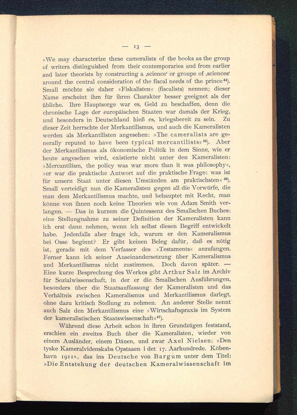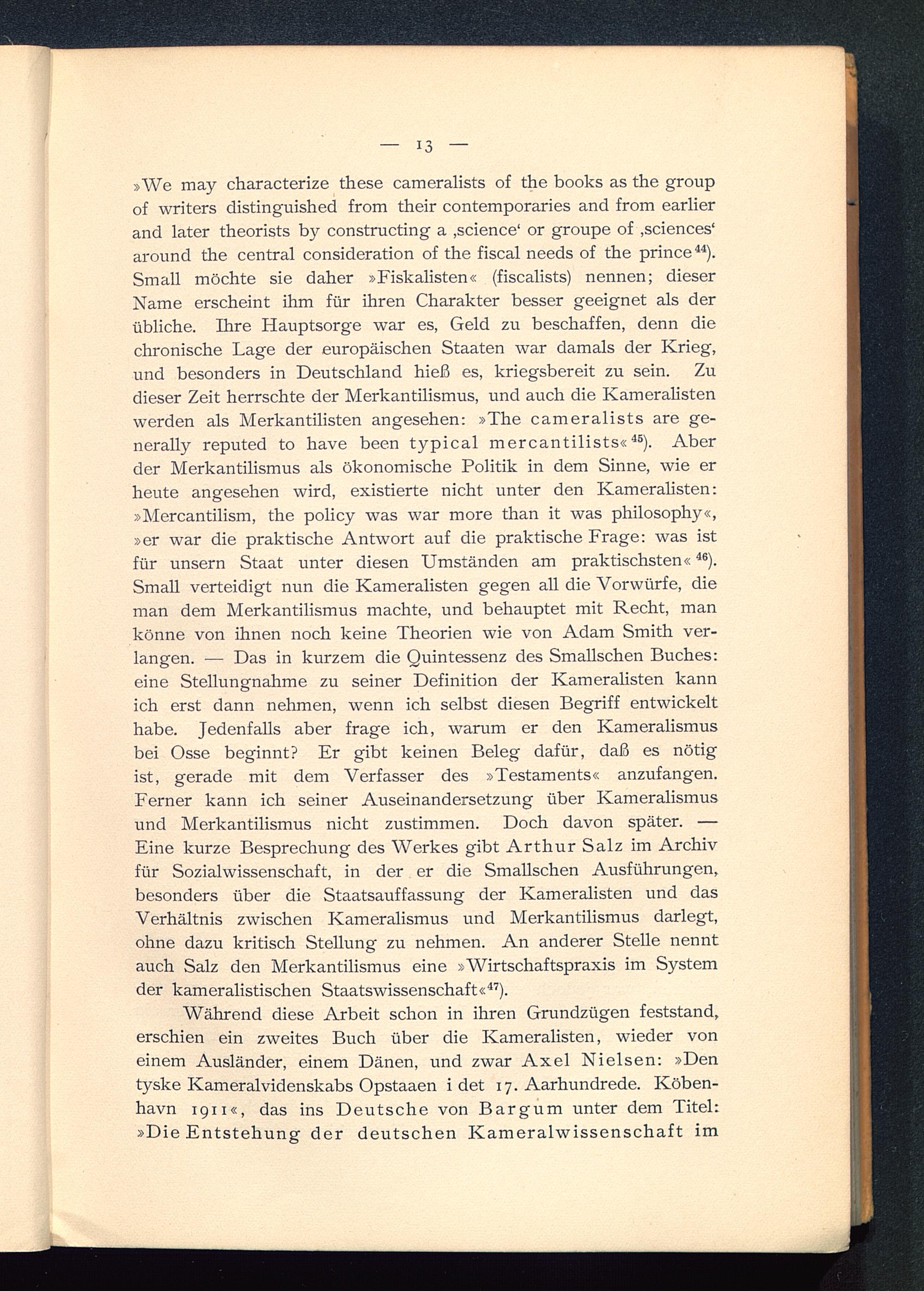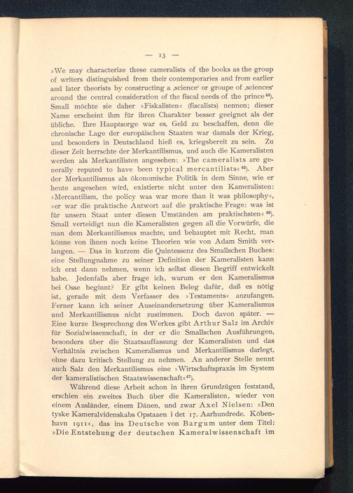 Während diese Arbeit schon in ihren Grundzügen feststand,erschien ein zweites Buch über die Kameralisten, wieder voneinem Ausländer, einem Dänen, und zwar Axel Nielsen: »Dentyske Kameralvidenskabs Opstaaen i det 17. Aarhundrede. Köben-havn 1911«, das ins Deutsche von Bargum unter dem Titel:»Die Entstehung der deutschen Kameralwissenschaft im