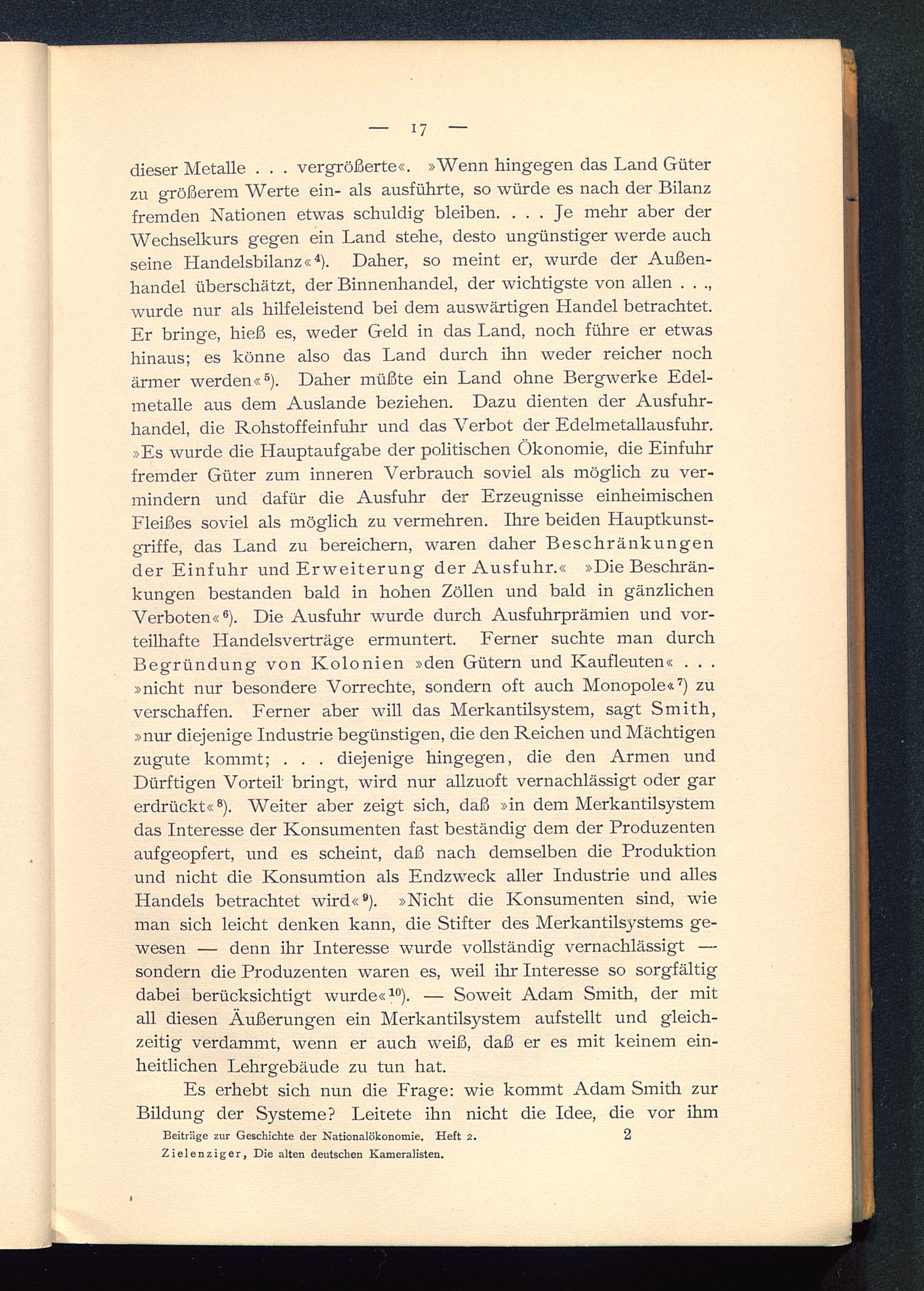 dieser Metalle . . . vergrößerte«. »Wenn hingegen das Land Güterzu größerem Werte ein- als ausführte, so würde es nach der Bilanzfremden Nationen etwas schuldig bleiben. ... Je mehr aber derWechselkurs gegen ein Land stehe, desto ungünstiger werde auchseine Handelsbilanz« 4 ). Daher, so meint er, wurde der Außen-handel überschätzt, der Binnenhandel, der wichtigste von allen . . .,wurde nur als hilfeleistend bei dem auswärtigen Handel betrachtet.Er bringe, hieß es, weder Geld in das Land, noch führe er etwashinaus; es könne also das Land durch ihn weder reicher nochärmer werden« 5 ). Daher müßte ein Land ohne Bergwerke Edel-metalle aus dem Auslande beziehen. Dazu dienten der Ausfuhr-handel, die Rohstoffeinfuhr und das Verbot der Edelmetallausfuhr.»Es wurde die Hauptaufgabe der politischen Ökonomie, die Einfuhrfremder Güter zum inneren Verbrauch soviel als möglich zu ver-mindern und dafür die Ausfuhr der Erzeugnisse einheimischenFleißes soviel als möglich zu vermehren. Ihre beiden Hauptkunst-griffe, das Land zu bereichern, waren daher Beschränkungender Einfuhr und Erweiterung der Ausfuhr.« »Die Beschrän-kungen bestanden bald in hohen Zöllen und bald in gänzlichenVerboten« 6 ). Die Ausfuhr wurde durch Ausfuhrprämien und vor-teilhafte Handelsverträge ermuntert. Ferner suchte man durchBegründung von Kolonien »den Gütern und Kaufleuten« . . .»nicht nur besondere Vorrechte, sondern oft auch Monopole« 7 ) zuverschaffen. Ferner aber will das Merkantilsystem, sagt Smith,»nur diejenige Industrie begünstigen, die den Reichen und Mächtigenzugute kommt; . . . diejenige hingegen, die den Armen undDürftigen Vorteil' bringt, wird nur allzuoft vernachlässigt oder garerdrückt« 8 ). Weiter aber zeigt sich, daß »in dem Merkantilsystemdas Interesse der Konsumenten fast beständig dem der Produzentenaufgeopfert, und es scheint, daß nach demselben die Produktionund nicht die Konsumtion als Endzweck aller Industrie und allesHandels betrachtet wird« 9 ). »Nicht die Konsumenten sind, wieman sich leicht denken kann, die Stifter des Merkantilsystems ge-wesen — denn ihr Interesse wurde vollständig vernachlässigt —sondern die Produzenten waren es, weil ihr Interesse so sorgfältigdabei berücksichtigt wurde« 10 ). — Soweit Adam Smith, der mitall diesen Äußerungen ein Merkantilsystem aufstellt und gleich-zeitig verdammt, wenn er auch weiß, daß er es mit keinem ein-heitlichen Lehrgebäude zu tun hat.