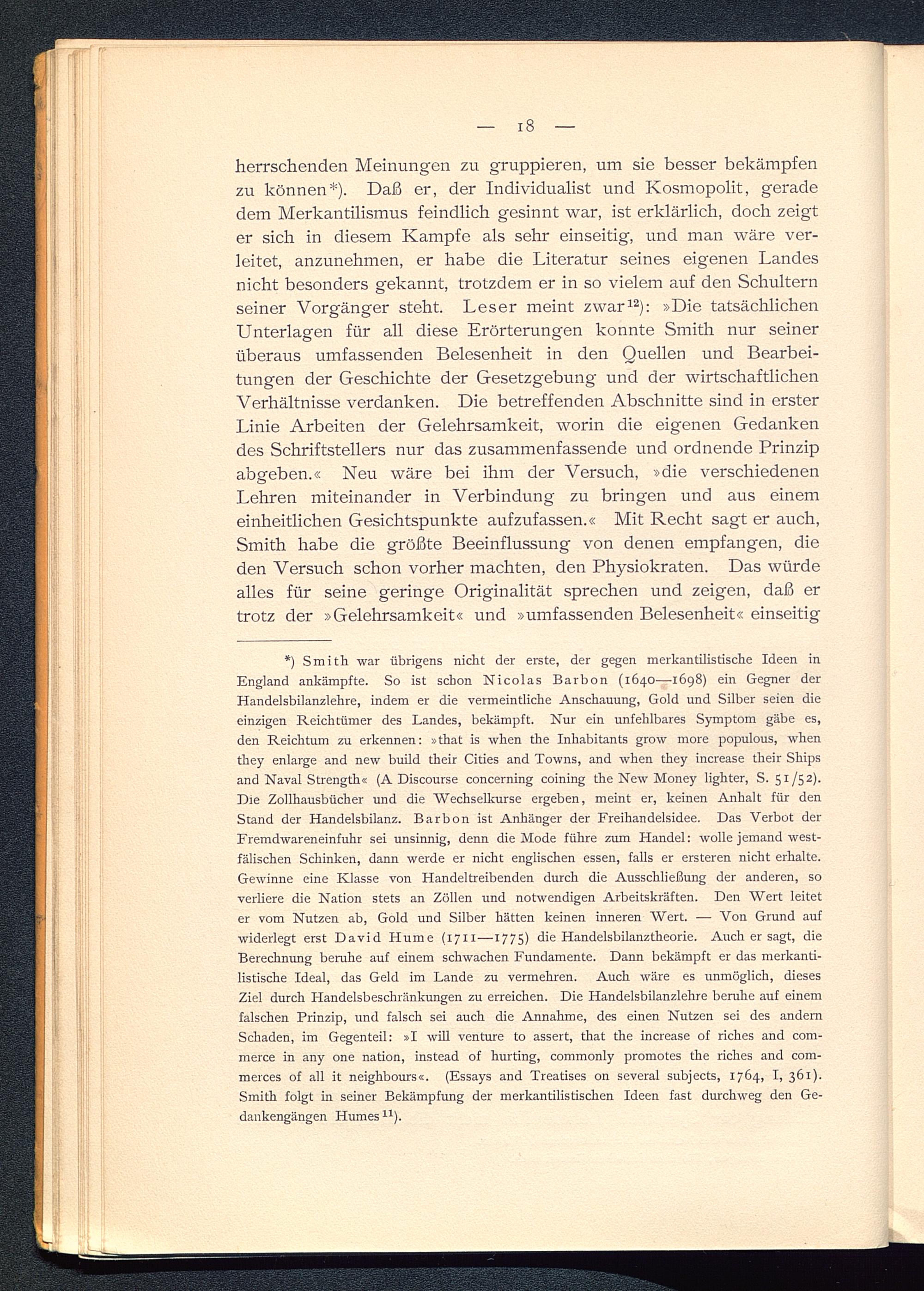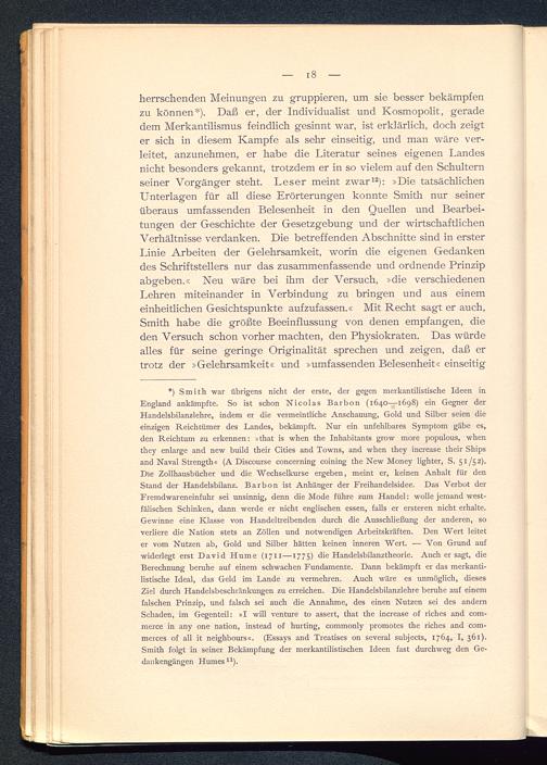 *) Smith war übrigens nicht der erste, der gegen merkantilistische Ideen inEngland ankämpfte. So ist schon Nicolas Barbon (1640—1698) ein Gegner derHandelsbilanzlehre, indem er die vermeintliche Anschauung, Gold und Silber seien dieeinzigen Reichtümer des Landes, bekämpft. Nur ein unfehlbares Symptom gäbe es,den Reichtum zu erkennen: »that is when the Inhabitants grow more populous, whenthey enlarge and new build their Cities and Towns, and when they increase their Shipsand Naval Strength« (A Discourse concerning coining the New Money lighter, S. 51/52).Hie Zollhausbücher und die Wechselkurse ergeben, meint er, keinen Anhalt für denStand der Handelsbilanz. Barbon ist Anhänger der Freihandelsidee. Das Verbot derFremdwareneinfuhr sei unsinnig, denn die Mode führe zum Handel: wolle jemand west-fälischen Schinken, dann werde er nicht englischen essen, falls er ersteren nicht erhalte.Gewinne eine Klasse von Handeltreibenden durch die Ausschließung der anderen, soverliere die Nation stets an Zöllen und notwendigen Arbeitskräften. Den Wert leiteter vom Nutzen ab, Gold und Silber hätten keinen inneren Wert. — Von Grund aufwiderlegt erst David Hume (1711— 1775 ) die Handelsbilanztheorie. Auch er sagt, dieBerechnung beruhe auf einem schwachen Fundamente. Dann bekämpft er das merkanti-listische Ideal, das Geld im Lande zu vermehren. Auch wäre es unmöglich, diesesZiel durch Handelsbeschränkungen zu erreichen. Die Handelsbilanzlehre beruhe auf einemfalschen Prinzip, und falsch sei auch die Annahme, des einen Nutzen sei des andernSchaden, im Gegenteil: »I will venture to assert, that the increase of riches and com-merce in any one nation, instead of hurting, commonly promotes the riches and com-merces of all it neighbours«. (Essays and Treatises on several subjects, 1764, I, 361).Smith folgt in seiner Bekämpfung der merkantilistischen Ideen fast durchweg den Ge-dankengängen Humes u ).