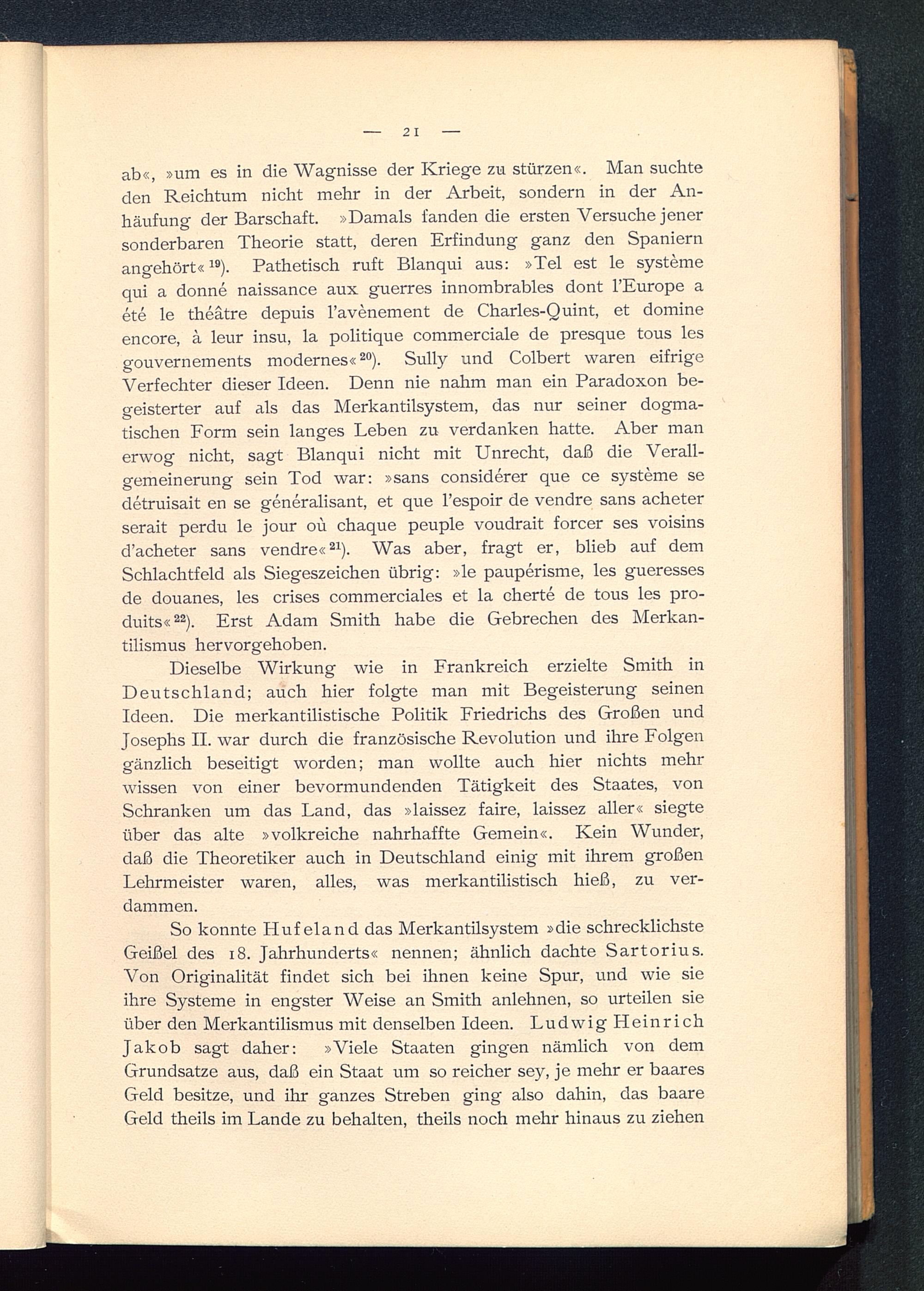 ab«, »um es in die Wagnisse der Kriege zu stürzen«. Man suchteden Reichtum nicht mehr in der Arbeit, sondern in der An-häufung der Barschaft. »Damals fanden die ersten Versuche jenersonderbaren Theorie statt, deren Erfindung ganz den Spaniernangehört« 19 ). Pathetisch ruft Blanqui aus: »Tel est le Systemequi a donne naissance aux guerres innombrables dont l’Europe aete le theätre depuis l’avenement de Charles-Quint, et domineencore, ä leur insu, la politique commerciale de presque tous lesgouvernements modernes« 20 ). Sully und Colbert waren eifrigeVerfechter dieser Ideen. Denn nie nahm man ein Paradoxon be-geisterter auf als das Merkantilsystem, das nur seiner dogma-tischen Form sein langes Leben zu verdanken hatte. Aber manerwog nicht, sagt Blanqui nicht mit Unrecht, daß die Verall-gemeinerung sein Tod war: »sans considerer que ce Systeme sedetruisait en se generalisant, et que l’espoir de vendre sans acheterserait perdu le jour oü chaque peuple voudrait forcer ses voisinsd’acheter sans vendre« 21 ). Was aber, fragt er, blieb auf demSchlachtfeld als Siegeszeichen übrig: »le pauperisme, les gueressesde douanes, les crises commerciales et la cherte de tous les pro-duits« 22 ). Erst Adam Smith habe die Gebrechen des Merkan-tilismus hervorgehoben.