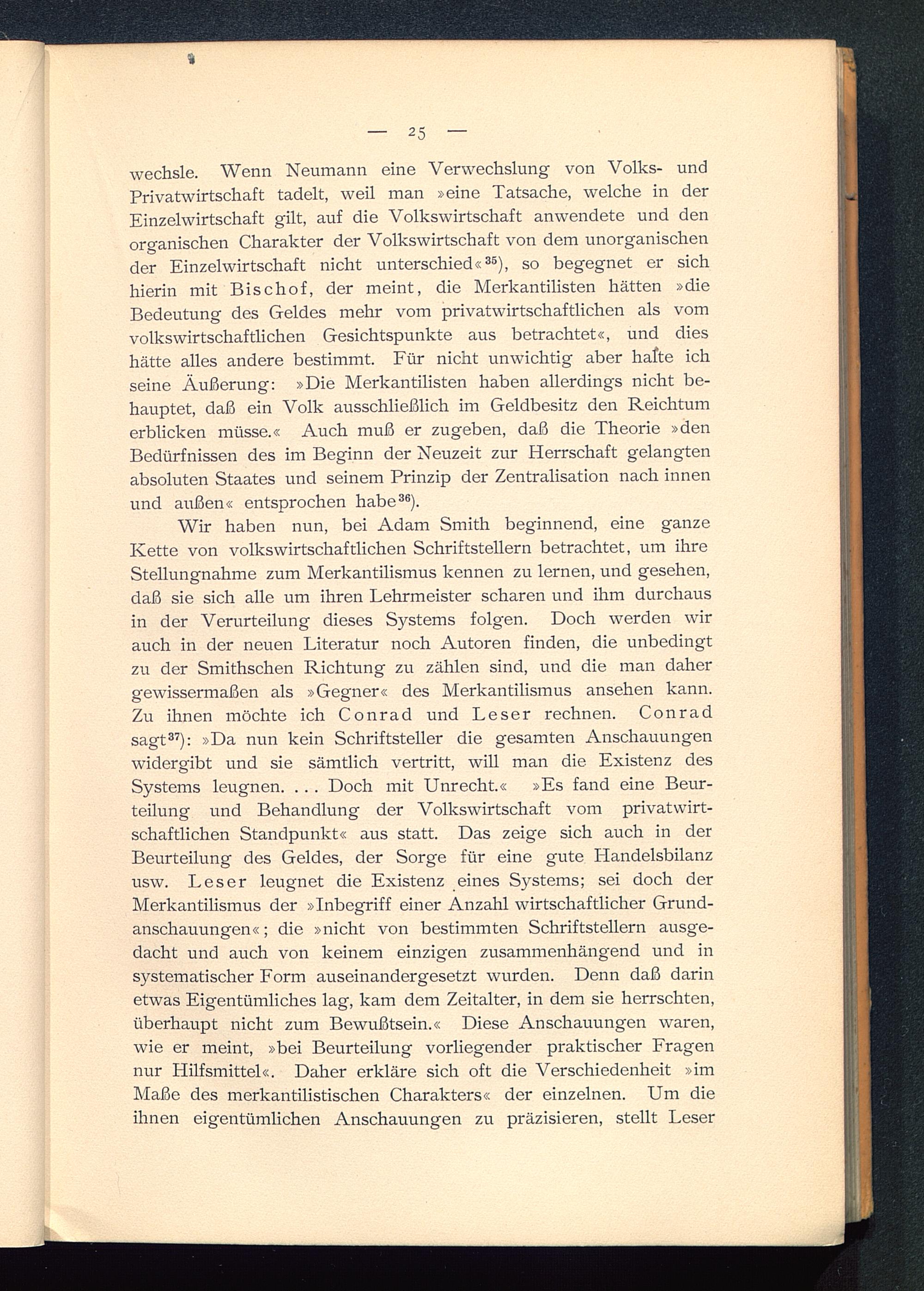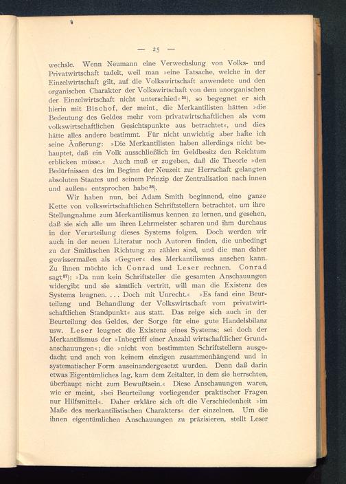 Wir haben nun, bei Adam Smith beginnend, eine ganzeKette von volkswirtschaftlichen Schriftstellern betrachtet, um ihreStellungnahme zum Merkantilismus kennen zu lernen, und gesehen,daß sie sich alle um ihren Lehrmeister scharen und ihm durchausin der Verurteilung dieses Systems folgen. Doch werden wirauch in der neuen Literatur noch Autoren finden, die unbedingtzu der Smithschen Richtung zu zählen sind, und die man dahergewissermaßen als »Gegner« des Merkantilismus ansehen kann.Zu ihnen möchte ich Conrad und Leser rechnen. Conradsagt 37 ): »Da nun kein Schriftsteller die gesamten Anschauungenwidergibt und sie sämtlich vertritt, will man die Existenz desSystems leugnen. . . . Doch mit Unrecht.« »Es fand eine Beur-teilung und Behandlung der Volkswirtschaft vom privatwirt-schaftlichen Standpunkt« aus statt. Das zeige sich auch in derBeurteilung des Geldes, der Sorge für eine gute Handelsbilanzusw. Leser leugnet die Existenz eines S}-stcms; sei doch derMerkantilismus der »Inbegriff einer Anzahl wirtschaftlicher Grund-anschauungen« ; die »nicht von bestimmten Schriftstellern ausge-dacht und auch von keinem einzigen zusammenhängend und insystematischer Form auseinandergesetzt wurden. Denn daß darinetwas Eigentümliches lag, kam dem Zeitalter, in dem sie herrschten,überhaupt nicht zum Bewußtsein.« Diese Anschauungen waren,wie er meint, »bei Beurteilung vorliegender praktischer Fragennur Hilfsmittel«. Daher erkläre sich oft die Verschiedenheit »imMaße des merkantilistischen Charakters« der einzelnen. Um dieihnen eigentümlichen Anschauungen zu präzisieren, stellt Leser