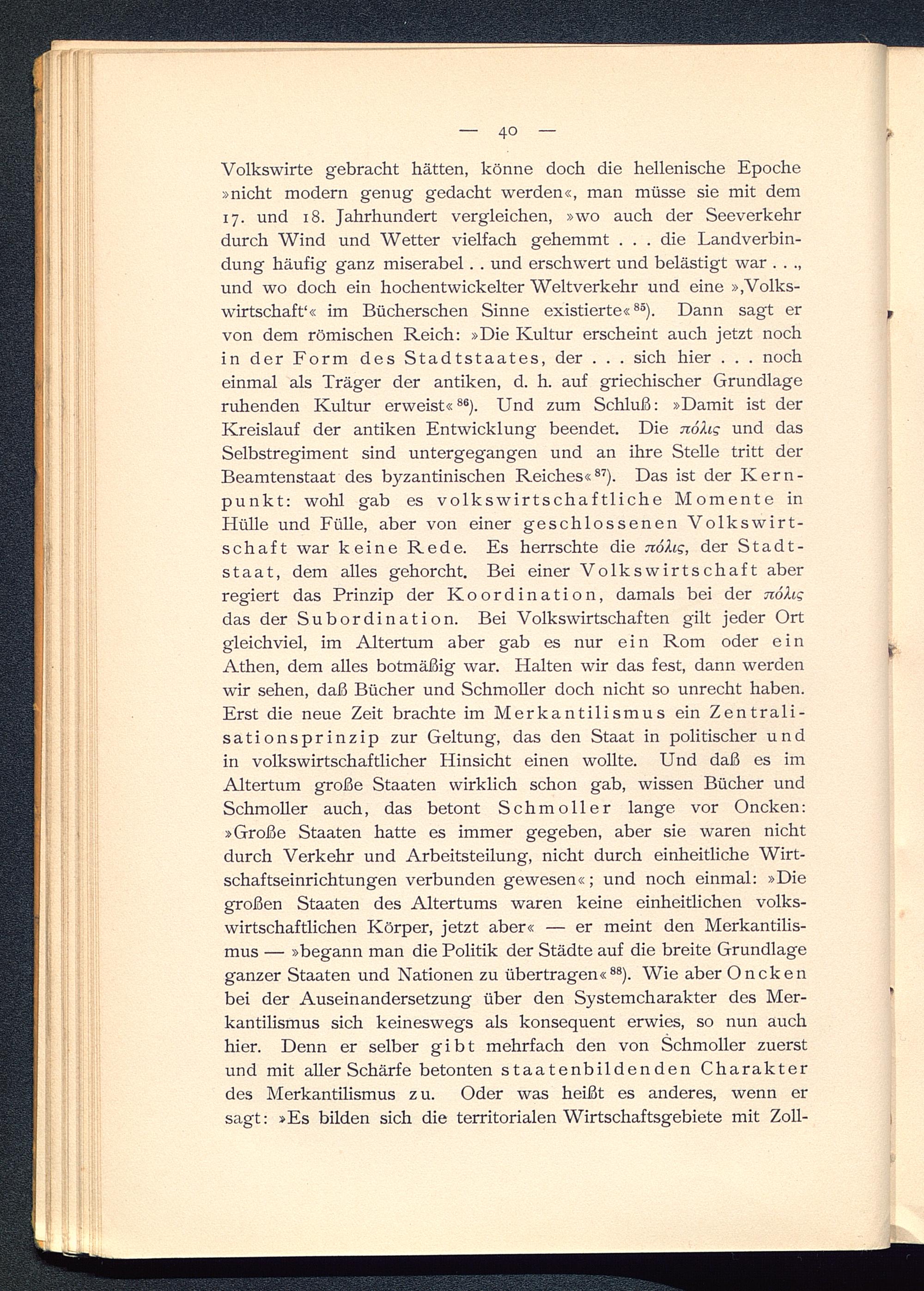 Volkswirte gebracht hätten, könne doch die hellenische Epoche»nicht modern genug gedacht werden«, man müsse sie mit dem17. und 18. Jahrhundert vergleichen, »wo auch der Seeverkehrdurch Wind und Wetter vielfach gehemmt . . . die Landverbin-dung häufig ganz miserabel. . und erschwert und belästigt war . . .,und wo doch ein hochentwickelter Weltverkehr und eine ».Volks-wirtschaft 1 « im Bücherschen Sinne existierte« 85 ). Dann sagt ervon dem römischen Reich: »Die Kultur erscheint auch jetzt nochin der Form des Stadtstaates, der . . . sich hier . . . nocheinmal als Träger der antiken, d. h. auf griechischer Grundlageruhenden Kultur erweist« 86 ). Und zum Schluß: »Damit ist derKreislauf der antiken Entwicklung beendet. Die nofog und dasSelbstregiment sind untergegangen und an ihre Stelle tritt derBeamtenstaat des byzantinischen Reiches« 87 ). Das ist der Kern-punkt: wohl gab es volkswirtschaftliche Momente inHülle und Fülle, aber von einer geschlossenen Volkswirt-schaft war keine Rede. Es herrschte die noXig, der Stadt-staat, dem alles gehorcht. Bei einer Volkswirtschaft aberregiert das Prinzip der Koordination, damals bei der nöXigdas der Subordination. Bei Volkswirtschaften gilt jeder Ortgleichviel, im Altertum aber gab es nur ein Rom oder einAthen , dem alles botmäßig war. Halten wir das fest, dann werdenwir sehen, daß Bücher und Schmoller doch nicht so unrecht haben.Erst die neue Zeit brachte im Merkantilismus ein Zentrali-sationsprinzip zur Geltung, das den Staat in politischer undin volkswirtschaftlicher Hinsicht einen wollte. Und daß es imAltertum große Staaten wirklich schon gab, wissen Bücher undSchmoller auch, das betont Schmoller lange vor Oncken:»Große Staaten hatte es immer gegeben, aber sie waren nichtdurch Verkehr und Arbeitsteilung, nicht durch einheitliche Wirt-schaftseinrichtungen verbunden gewesen«; und noch einmal: »Diegroßen Staaten des Altertums waren keine einheitlichen volks-wirtschaftlichen Körper, jetzt aber« — er meint den Merkantilis-mus — »begann man die Politik der Städte auf die breite Grundlageganzer Staaten und Nationen zu übertragen« 88 ). Wie aber Onckenbei der Auseinandersetzung über den Systemcharakter des Mer-kantilismus sich keineswegs als konsequent erwies, so nun auchhier. Denn er selber gibt mehrfach den von Schmoller zuerstund mit aller Schärfe betonten staatenbildenden Charakterdes Merkantilismus z u. Oder was heißt es anderes, wenn ersagt: »Es bilden sich die territorialen Wirtschaftsgebiete mit Zoll-