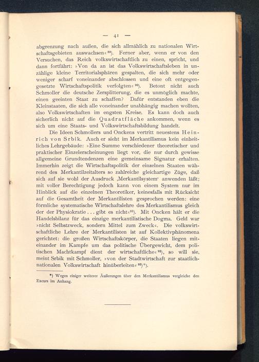 abgrenzung nach außen, die sich allmählich zu nationalen Wirt-schaftsgebieten auswachsen« 89 ). Ferner aber, wenn er von denVersuchen, das Reich volkswirtschaftlich zu einen, spricht, unddann fortfährt: »Von da an ist das Volkswirtschaftsleben in un-zählige kleine Territorialsphären gespalten, die sich mehr oderweniger scharf voneinander abschlossen und eine oft entgegen-gesetzte Wirtschaftspolitik verfolgten« 90 ). Betont nicht auchSchmoller die deutsche Zersplitterung, die es unmöglich machte,einen geeinten Staat zu schaffen? Dafür entstanden eben dieKleinstaaten, die sich alle voneinander unabhängig machen wollten,also Volkswirtschaften im engsten Kreise. Es kann doch auchsicherlich nicht auf die Quadratfläche ankommen, wenn essich um eine Staats- und Volkswirtschaftsbildung handelt.