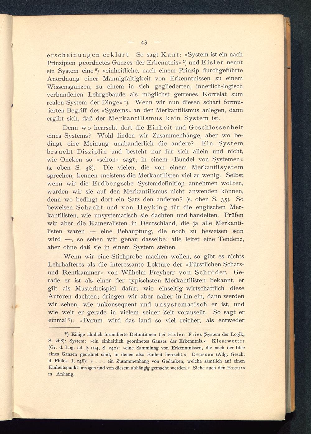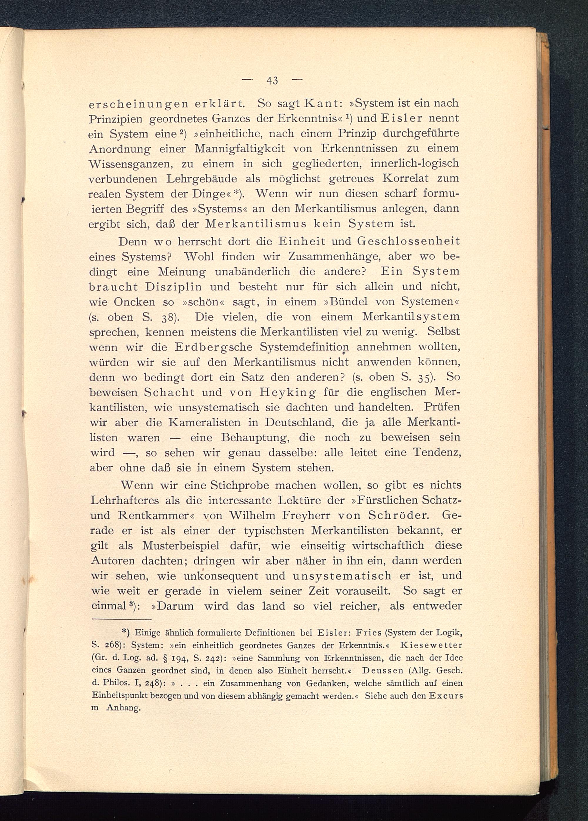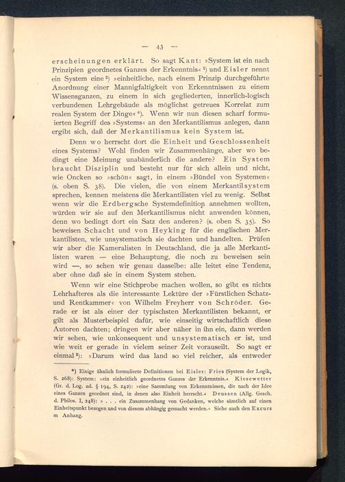 erscheinungen erklärt. So sagt Kant: »System ist ein nachPrinzipien geordnetes Ganzes der Erkenntnis« *) und Eisler nenntein System eine 2 ) »einheitliche, nach einem Prinzip durchgeführteAnordnung einer Mannigfaltigkeit von Erkenntnissen zu einemWissensganzen, zu einem in sich gegliederten, innerlich-logischverbundenen Lehrgebäude als möglichst getreues Korrelat zumrealen System der Dinge«*). Wenn wir nun diesen scharf formu-ierten Begriff des »Systems« an den Merkantilismus anlegen, dannergibt sich, daß der Merkantilismus kein System ist.