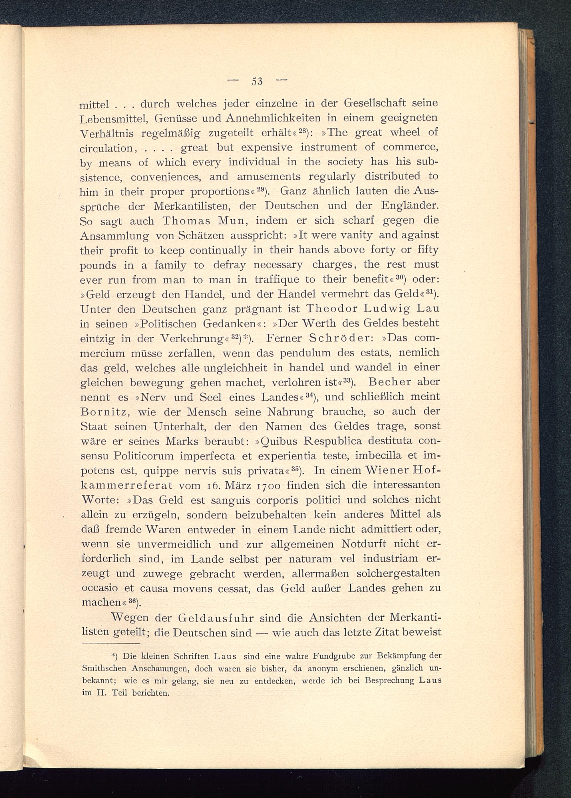 mittel . . . durch welches jeder einzelne in der Gesellschaft seineLebensmittel, Genüsse und Annehmlichkeiten in einem geeignetenVerhältnis regelmäßig zugeteilt erhält« 28 ): »The great wheel ofcirculation, .... great but expensive instrument of commerce,by means of which every individual in the society has his sub-sistence, conveniences, and amusements regularly distributed tohim in their proper proportions« 29 ). Ganz ähnlich lauten die Aus-sprüche der Merkantilisten, der Deutschen und der Engländer.So sagt auch Thomas Mun, indem er sich scharf gegen dieAnsammlung von Schätzen ausspricht: »It were vanity and againsttheir profit to keep continually in their hands above forty or fiftypounds in a family to defray necessary charges, the rest mustever run from man to man in traffique to their benefit« 30 ) oder:»Geld erzeugt den Handel, und der Handel vermehrt das Geld« 31 ).Unter den Deutschen ganz prägnant ist Theodor Ludwig Lauin seinen »Politischen Gedanken«: »Der Werth des Geldes bestehteintzig in der Verkehrung« 32 )*). Ferner Schröder: »Das com-mercium müsse zerfallen, wenn das pendulum des estats, nemlichdas geld, welches alle Ungleichheit in handel und wandel in einergleichen bewegung gehen machet, verlohren ist« 33 ). Becher abernennt es »Nerv und Seel eines Landes« 34 ), und schließlich meintBornitz, wie der Mensch seine Nahrung brauche, so auch derStaat seinen Unterhalt, der den Namen des Geldes trage, sonstwäre er seines Marks beraubt: »Quibus Respublica destituta con-sensu Politicorum imperfecta et experientia teste, imbecilla et im-potens est, quippe nervis suis privata« 35 ). In einem Wiener Hof-kammerreferat vom 16. März 1700 finden sich die interessantenWorte: »Das Geld est sanguis corporis politici und solches nichtallein zu erzügeln, sondern beizubehalten kein anderes Mittel alsdaß fremde Waren entweder in einem Lande nicht admittiert oder,wenn sie unvermeidlich und zur allgemeinen Notdurft nicht er-forderlich sind, im Lande selbst per naturam vel industriam er-zeugt und zuwege gebracht werden, allermaßen solchergestaltenoccasio et causa movens cessat, das Geld außer Landes gehen zumachen« 36 ).
