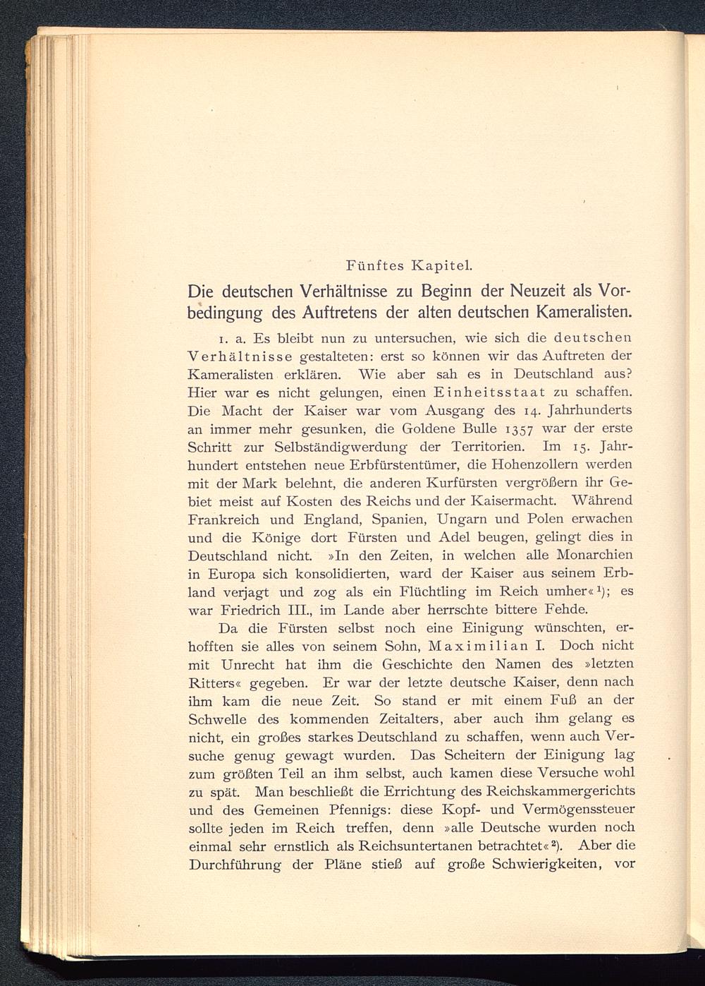 i. a. Es bleibt nun zu untersuchen, wie sich die deutschen Verhältnisse gestalteten: erst so können wir das Auftreten derKameralisten erklären. Wie aber sah es in Deutschland aus?Hier war es nicht gelungen, einen Einheitsstaat zu schaffen.Die Macht der Kaiser war vom Ausgang des 14. Jahrhundertsan immer mehr gesunken, die Goldene Bulle 1357 war der ersteSchritt zur Selbständigwerdung der Territorien. Im 15. Jahr-hundert entstehen neue Erbfürstentümer, die Hohenzollern werdenmit der Mark belehnt, die anderen Kurfürsten vergrößern ihr Ge-biet meist auf Kosten des Reichs und der Kaisermacht. WährendFrankreich und England, Spanien, Ungarn und Polen erwachenund die Könige dort Fürsten und Adel beugen, gelingt dies inDeutschland nicht. »In den Zeiten, in welchen alle Monarchienin Europa sich konsolidierten, ward der Kaiser aus seinem Erb-land verjagt und zog als ein Flüchtling im Reich umher« 1 ); eswar Friedrich III., im Lande aber herrschte bittere Fehde.