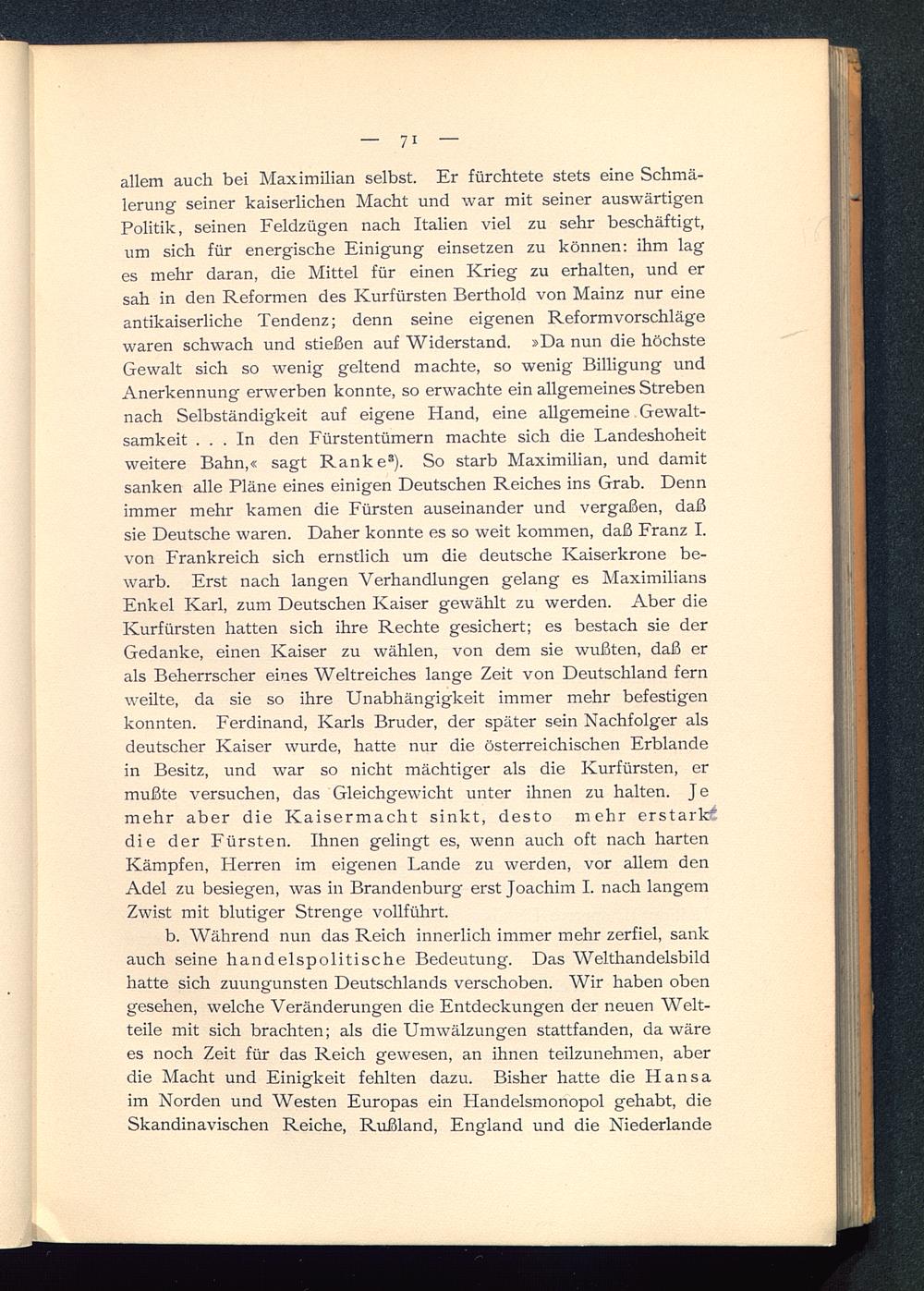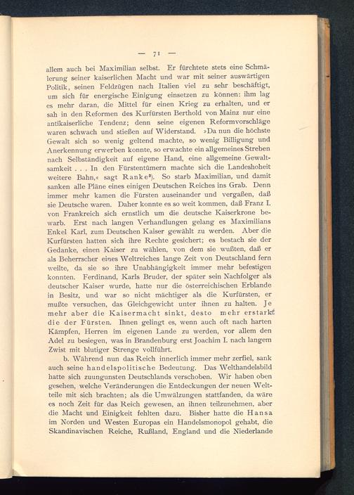 b. Während nun das Reich innerlich immer mehr zerfiel, sankauch seine handelspolitische Bedeutung. Das Welthandelsbildhatte sich zuungunsten Deutschlands verschoben. Wir haben obengesehen, welche Veränderungen die Entdeckungen der neuen Welt-teile mit sich brachten; als die Umwälzungen stattfanden, da wärees noch Zeit für das Reich gewesen, an ihnen teilzunehmen, aberdie Macht und Einigkeit fehlten dazu. Bisher hatte die Hansaim Norden und Westen Europas ein Handelsmonopol gehabt, dieSkandinavischen Reiche, Rußland, England und die Niederlande