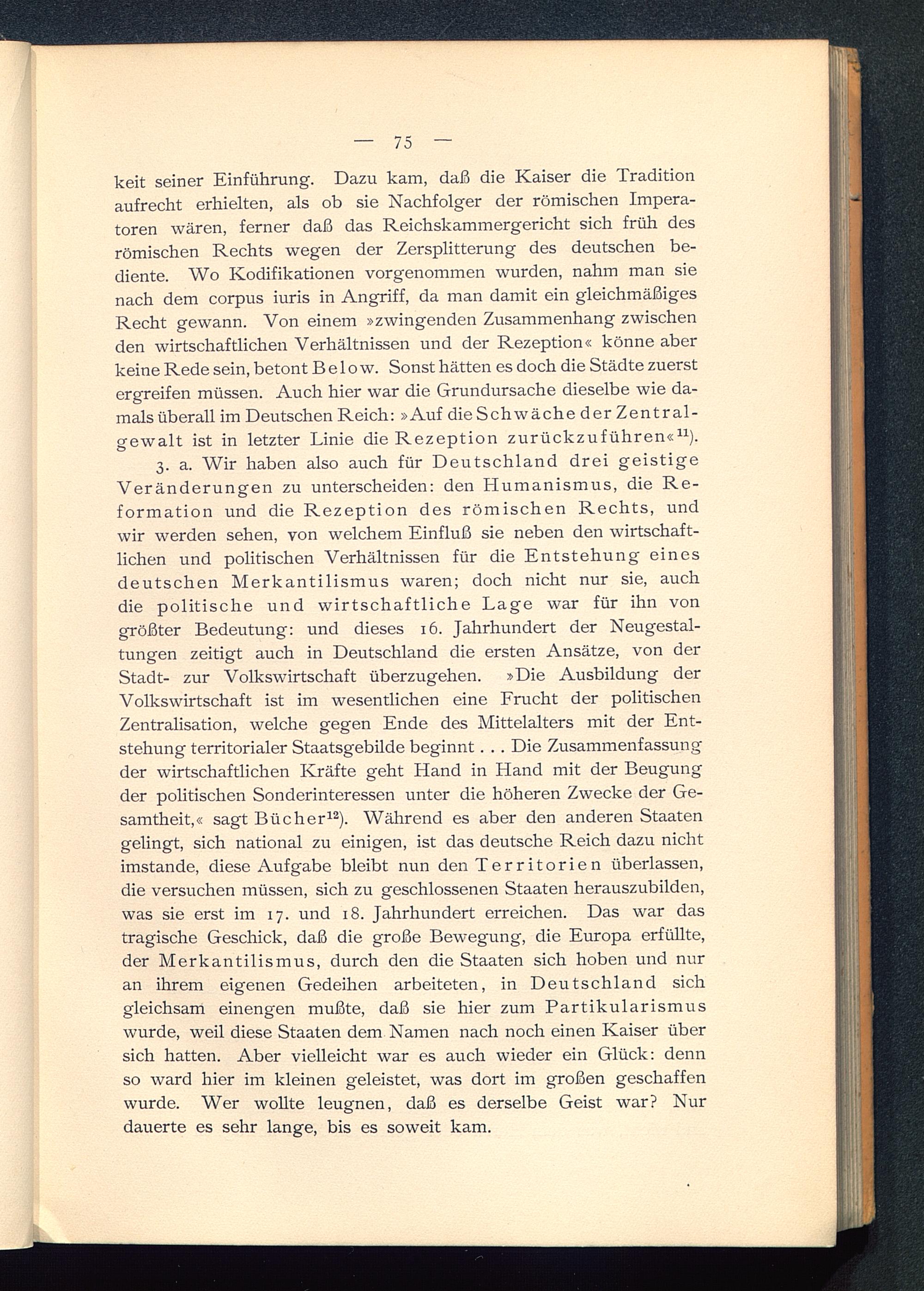 3. a. Wir haben also auch für Deutschland drei geistigeVeränderungen zu unterscheiden: den Humanismus, die Re-formation und die Rezeption des römischen Rechts, undwir werden sehen, von welchem Einfluß sie neben den wirtschaft-lichen und politischen Verhältnissen für die Entstehung einesdeutschen Merkantilismus waren; doch nicht nur sie, auchdie politische und wirtschaftliche Lage war für ihn vongrößter Bedeutung: und dieses 16. Jahrhundert der Neugestal-tungen zeitigt auch in Deutschland die ersten Ansätze, von derStadt- zur Volkswirtschaft überzugehen. »Die Ausbildung derVolkswirtschaft ist im wesentlichen eine Frucht der politischenZentralisation, welche gegen Ende des Mittelalters mit der Ent-stehung territorialer Staatsgebilde beginnt. . . Die Zusammenfassungder wirtschaftlichen Kräfte geht Hand in Hand mit der Beugungder politischen Sonderinteressen unter die höheren Zwecke der Ge-samtheit,« sagt Bücher 12 ). Während es aber den anderen Staatengelingt, sich national zu einigen, ist das deutsche Reich dazu nichtimstande, diese Aufgabe bleibt nun den Territorien überlassen,die versuchen müssen, sich zu geschlossenen Staaten herauszubilden,was sie erst im 17. und 18. Jahrhundert erreichen. Das war dastragische Geschick, daß die große Bewegung, die Europa erfüllte,der Merkantilismus, durch den die Staaten sich hoben und nuran ihrem eigenen Gedeihen arbeiteten, in Deutschland sichgleichsam einengen mußte, daß sie hier zum Partikularismuswurde, weil diese Staaten dem Namen nach noch einen Kaiser übersich hatten. Aber vielleicht war es auch wieder ein Glück: dennso ward hier im kleinen geleistet, was dort im großen geschaffenwurde. Wer wollte leugnen, daß es derselbe Geist war? Nurdauerte es sehr lange, bis es soweit kam.