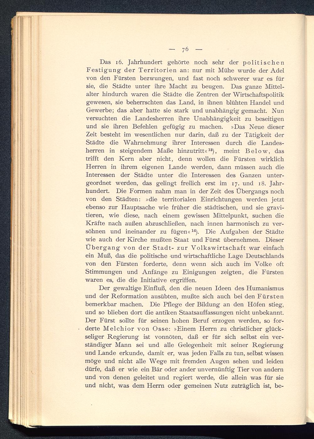 Der gewaltige Einfluß, den die neuen Ideen des Humanismusund der Reformation ausübten, mußte sich auch bei den Fürsten bemerkbar machen. Die Pflege der Bildung an den Höfen stieg,und so blieben dort die antiken Staatsauffassungen nicht unbekannt.Der Fürst sollte für seinen hohen Beruf erzogen werden, so for-derte Melchior von Osse: »Einem Herrn zu christlicher glück-seliger Regierung ist vonnöten, daß er für sich selbst ein ver-ständiger Mann sei und alle Gelegenheit mit seiner Regierungund Lande erkunde, damit er, was jeden Falls zu tun, selbst wissenmöge und nicht alle Wege mit fremden Augen sehen und leidendürfe, daß er wie ein Bär oder ander unvernünftig Tier von andernund von denen geleitet und regiert werde, die allein was für sieund nicht, was dem Herrn oder gemeinen Nutz zuträglich ist, be-