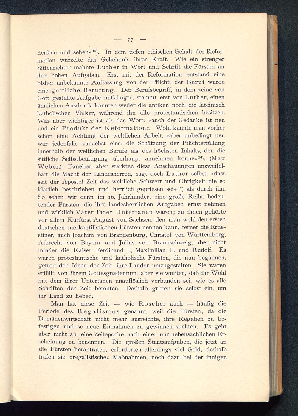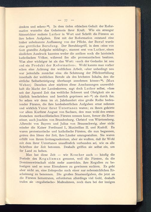 denken und sehen« 18 ). In dem tiefen ethischen Gehalt der Refor-mation wurzelte das Geheimnis ihrer Kraft. Wie ein strengerSittenrichter mahnte Luther in Wort und Schrift die Fürsten anihre hohen Aufgaben. Erst mit der Reformation entstand einebisher unbekannte Auffassung von der Pflicht, der Beruf wurdeeine göttliche Berufung. Der Berufsbegriff, in dem »eine vonGott gestellte Aufgabe mitklingt«, stammt erst von Luther, einenähnlichen Ausdruck kannten weder die antiken noch die lateinischkatholischen Völker, während ihn alle protestantischen besitzen.Was aber wichtiger ist als das Wort: »auch der Gedanke ist neuund ein Produkt der Reformation«. Wohl kannte man vorherschon eine Achtung der weltlichen Arbeit, »aber unbedingt neuwar jedenfalls zunächst eins: die Schätzung der Pflichterfüllunginnerhalb der weltlichen Berufe als des höchsten Inhalts, den diesittliche Selbstbetätigung überhaupt annehmen könne« 16 ). (MaxWeber .) Daneben aber stärkten diese Anschauungen unzweifel-haft die Macht der Landesherren, sagt doch Luther selbst, »dassseit der Apostel Zeit das weltliche Schwert und Obrigkeit nie soklärlich beschrieben und herrlich gepriesen sei« 17 ) als durch ihn.So sehen wir denn im 16. Jahrhundert eine große Reihe bedeu-tender Fürsten, die ihre landesherrlichen Aufgaben ernst nehmenund wirklich Väter ihrer Untertanen waren; zu ihnen gehörtevor allem Kurfürst August von Sachsen, den man wohl den erstendeutschen merkantilistischen Fürsten nennen kann, ferner die Erne-stiner, auch Joachim von Brandenburg, Christof von Württemberg,Albrecht von Bayern und Julius von Braunschweig, aber nichtminder die Kaiser Ferdinand I., Maximilian II. und Rudolf. Eswaren protestantische und katholische Fürsten, die nun begannen,getreu den Ideen der Zeit, ihre Länder umzugestalten. Sie warenerfüllt von ihrem Gottesgnadentum, aber sie wußten, daß ihr Wohlmit dem ihrer Untertanen unauflöslich verbunden sei, wie es alleSchriften der Zeit betonten. Deshalb griffen sie selbst ein, umihr Land zu heben.