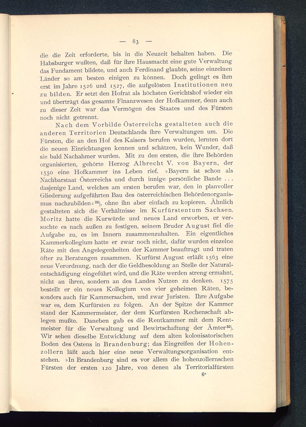 Nach dem Vorbilde Österreichs gestalteten auch dieanderen Territorien Deutschlands ihre Verwaltungen um. DieFürsten , die an den Hof des Kaisers berufen wurden, lernten dortdie neuen Einrichtungen kennen und schätzen, kein Wunder, daßsie bald Nachahmer wurden. Mit zu den ersten, die ihre Behördenorganisierten, gehörte Herzog Albrecht V. von Bayern, der1550 eine Hofkammer ins Leben rief. »Bayern ist schon alsNachbarstaat Österreichs und durch innige persönliche Bande . . .dasjenige Land, welches am ersten berufen war, den in planvollerGliederung aufgeführten Bau des österreichischen Behördenorganis-mus nachzubilden« 32 ), ohne ihn aber einfach zu kopieren. Ähnlichgestalteten sich die Verhältnisse im Kurfürstentum Sachsen.Moritz hatte die Kurwürde und neues Land erworben, er ver-suchte es nach außen zu festigen, seinem Bruder August fiel dieAufgabe zu, es im Innern zusammenzuhalten. Ein eigentlichesKammerkollegium hatte er zwar noch nicht, dafür wurden einzelneRäte mit den Angelegenheiten der Kammer beauftragt und tratenöfter zu Beratungen zusammen. Kurfürst August erläßt 1563 eineneue Verordnung, nach der die Geldbesoldung an Stelle der Natural-entschädigung eingeführt wird, und die Räte werden streng ermahnt,nicht an ihren, sondern an des Landes Nutzen zu denken. 1575bestellt er ein neues Kollegium von vier geheimen Räten, be-sonders auch für Kammersachen, und zwar Juristen. Ihre Aufgabewar es, dem Kurfürsten zu folgen. An der Spitze der Kammerstand der Kammermeister, der dem Kurfürsten Rechenschaft ab-legen mußte. Daneben gab es die Rentkammer mit dem Rent-meister für die Verwaltung und Bewirtschaftung der Ämter 33 ).Wir sehen dieselbe Entwicklung auf dem alten kolonisatorischenBoden des Ostens in Brandenburg ; das Eingreifen der Hohen-zollern läßt auch hier eine neue Verwaltungsorganisation ent-stehen. »In Brandenburg sind es vor allem die hohenzollernschenFürsten der ersten 120 Jahre, von denen als Territorialfürsten