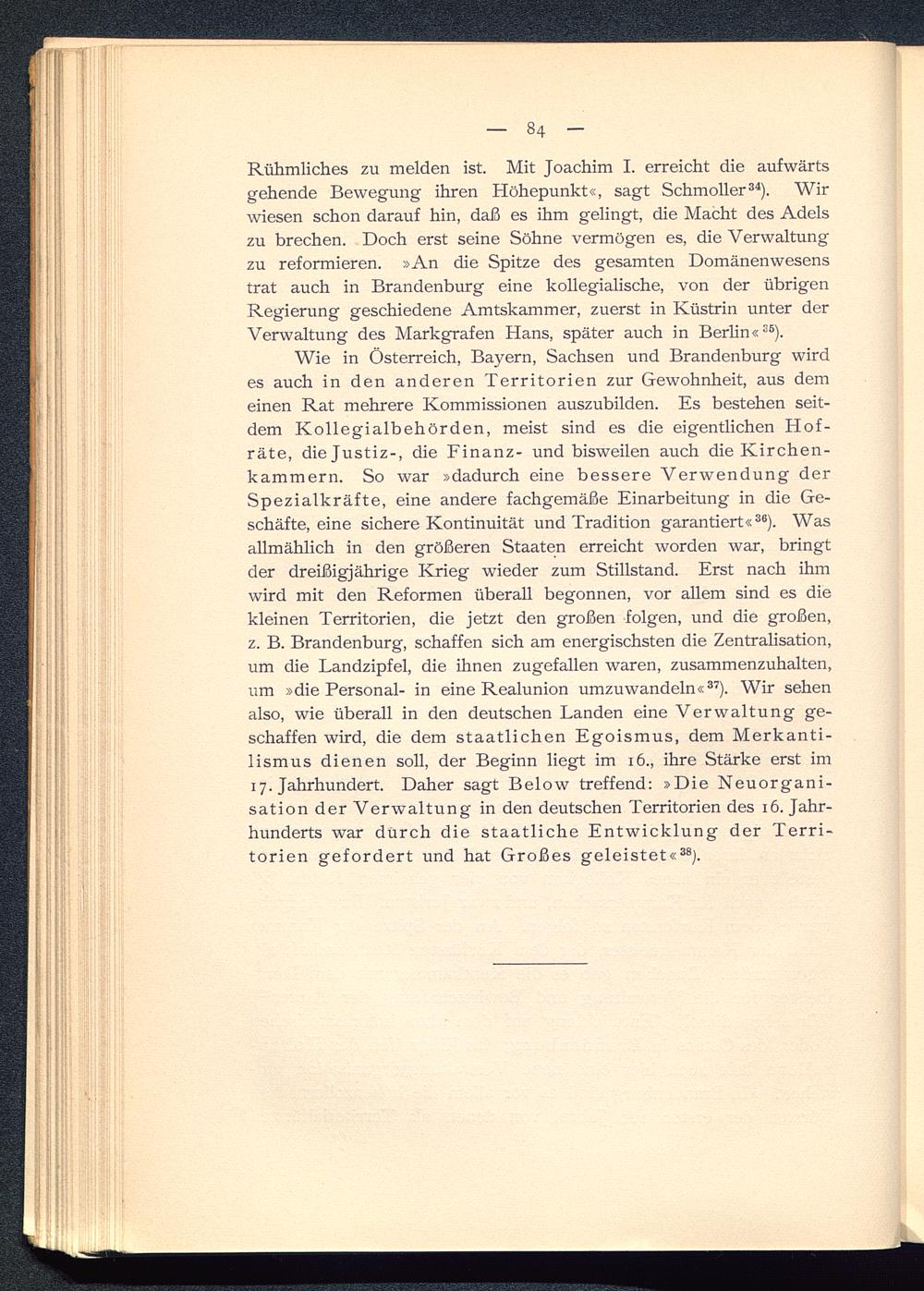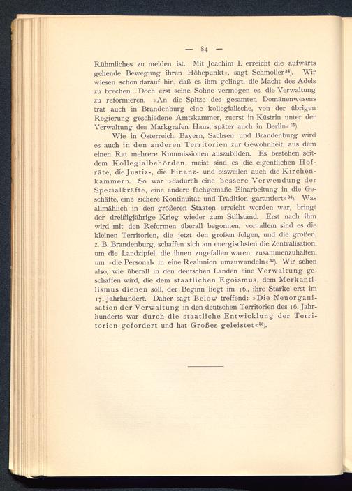 Wie in Österreich, Bayern, Sachsen und Brandenburg wirdes auch in den anderen Territorien zur Gewohnheit, aus demeinen Rat mehrere Kommissionen auszubilden. Es bestehen seit-dem Kollegialbehörden, meist sind es die eigentlichen Hof-räte, die Justiz-, die Finanz- und bisweilen auch die Kirchen-kammern. So war »dadurch eine bessere Verwendung derSpezialkräfte, eine andere fachgemäße Einarbeitung in die Ge-schäfte, eine sichere Kontinuität und Tradition garantiert« 36 ). Wasallmählich in den größeren Staaten erreicht worden war, bringtder dreißigjährige Krieg wieder zum Stillstand. Erst nach ihmwird mit den Reformen überall begonnen, vor allem sind es diekleinen Territorien, die jetzt den großen folgen, und die großen,z. B. Brandenburg, schaffen sich am energischsten die Zentralisation,um die Landzipfel, die ihnen zugefallen waren, zusammenzuhalten,um »die Personal- in eine Realunion umzuwandeln« 37 ). Wir sehenalso, wie überall in den deutschen Landen eine Verwaltung ge-schaffen wird, die dem staatlichen Egoismus, dem Merkanti-lismus dienen soll, der Beginn liegt im 16., ihre Stärke erst im17. Jahrhundert. Daher sagt Below treffend: »Die Neuorgani-sation der Verwaltung in den deutschen Territorien des 16. Jahr-hunderts war dürch die staatliche Entwicklung der Terri-torien gefordert und hat Großes geleistet« 38 ).