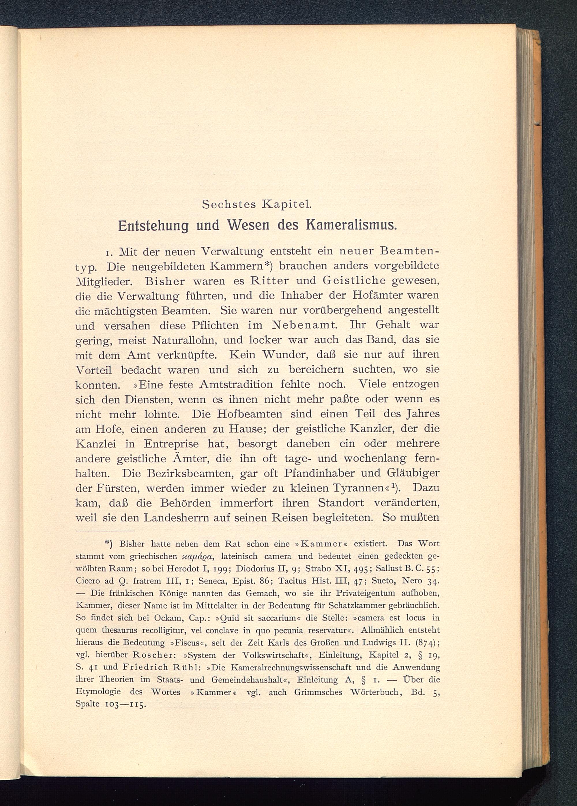 *) Bisher hatte neben dem Rat schon eine »Kammer« existiert. Das Wortstammt vom griechischen xa.fx6.Qa , lateinisch Camera und bedeutet einen gedeckten ge-wölbten Raum; so bei Herodot I, 199; Diodorius II, 9; Strabo XI, 495; Sallust B. C. 55;Cicero ad Q. fratrem III, 1; Seneca , Epist. 86; Tacitus Hist. III, 47; Sueto, Nero 34.— Die fränkischen Könige nannten das Gemach, wo sie ihr Privateigentum aufhoben,Kammer, dieser Name ist im Mittelalter in der Bedeutung für Schatzkammer gebräuchlich.So findet sich bei Ockam, Cap.: »Quid sit saccarium« die Stelle: »Camera est locus inquem thesaurus recolligitur, vel conclave in quo pecunia reservatur«. Allmählich entstehthieraus die Bedeutung »Fiscus«, seit der Zeit Karls des Großen und Ludwigs II. (874);vgl. hierüber Roscher: »System der Volkswirtschaft«, Einleitung, Kapitel 2, § 19,S. 41 und Friedrich Rühl: »Die Kameralrechnungswissenschaft und die Anwendungihrer Theorien im Staats- und Gemeindehaushalt«, Einleitung A, § I. — Über dieEtymologie des Wortes »Kammer« vgl. auch Grimmsches Wörterbuch, Bd. 5,Spalte 103—115.