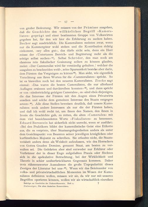 von großer Bedeutung. Wir müssen von der Prämisse ausgehen,daß die Geschichte den willkürlichen Begriff »Kamera-listen« geprägt und einer bestimmten Gruppe von Volkswirtengegeben hat, für den wir hier die Erklärung zu suchen haben.Becher sagt ausdrücklich: Die Kameralisten meinten zwar, wennnur die Kammergüter wohl stehen und die Kontribution richtigeinkommt, »sey alles gut«, das dürfe nicht sein, denn ein Herrmüsse der »Untertanen Bereich- und Begüterung mehr als dieseinige selbst suchen« 41 ). Selbst Schröder, den man noch amehestens rein fiskalischer Gesinnung zeihen zu können glaubte,meint: »Der Cammeralist wird für verständig gehalten / welcher dieausgaben zu beschneiden weiß«, seine Sparsamkeit bestehe aber darin,dem Fürsten das Vergnügen zu kürzen 42 ). Man sieht, wie eigentlichVerachtung aus ihren Worten für die »Cammeralisten« spricht. Soist es bisweilen noch bei den neueren Kameralisten. Zincke sagteinmal: »Das waren die besten Cameralisten, die nur allerhandAuflagen ersinnen und durchtreiben konnten« 43 ), und dann sprichter von »niederträchtig geizigen Camerales«, es »sind eben diejenigen,die das Interesse der Fürsten mit den Augen eines Privatwirtsansehen und solche dem gemeinen Interesse des Staats entgegensetzen« 44 ). Alle diese Stellen beweisen deutlich, daß unsere Kame-ralisten noch andere Interessen als nur die der Fürsten haben,und daß ich wohl recht tat, um ihnen den Namen, den ihnen inIronie die Geschichte gab, zu retten, die alten »Camerales« mitdem viel bezeichnenderen Worte »Fiskalisten« zu benennen.Eduard Bernstein hat sicherlich nicht unrecht, wenn er ausführt:»Bei den Praktikern bildet der kameralistische Geist eine Etiketteaus, die es verpönte, über Staatsangelegenheiten anders als unterdem Gesichtspunkt von Beamten seiner jeweiligen königlichen oderkurfürstlichen Majestät zu schreiben. Sie erlaubte nicht, die Staats-weisheit anders denn als Weisheit aufzufassen, wie des Herrschersvon Gottes Gnaden Domäne, genannt Staat, am besten zu ver-walten sei. Die Gelehrten aber sind entweder nur Erklärer oderVerbrämer der in dieser Enge auf gefaßten Praxis oder flüchtensich in die spekulative Betrachtung, bei der Wirklichkeit undTheorie in schier unüberbrückbaren Gegensatz kommen. Dahertrotz rühmenswerter Ausnahmen die große Unpopularität diesesZweiges der Literatur bei uns« 46 ). Wenn wir das Beieinander vonvolks- und privatwirtschaftlichen Momenten im Wesen der Kame-ralisten definieren wollen, müssen wir sie, da wir nur mit unserenBegriffen operieren können, wollen wir sie wirtschaftlich einreihen