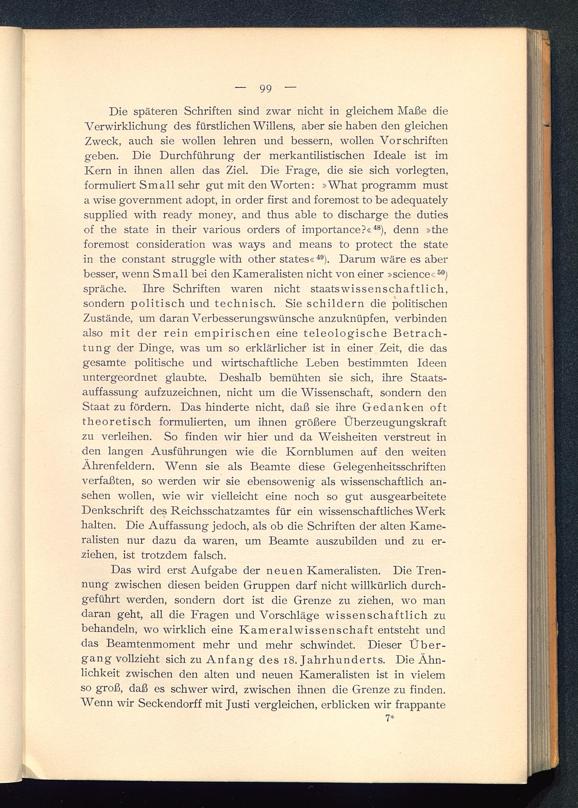 Das wird erst Aufgabe der neuen Kameralisten. Die Tren-nung zwischen diesen beiden Gruppen darf nicht willkürlich durch-geführt werden, sondern dort ist die Grenze zu ziehen, wo mandaran geht, all die Fragen und Vorschläge wissenschaftlich zubehandeln, wo wirklich eine Kameralwissenschaft entsteht unddas Beamtenmoment mehr und mehr schwindet. Dieser Über-gang vollzieht sich zu Anfang des 18. Jahrhunderts. Die Ähn-lichkeit zwischen den alten und neuen Kameralisten ist in vielemso groß, daß es schwer wird, zwischen ihnen die Grenze zu finden.Wenn wir Seckendorff mit Justi vergleichen, erblicken wir frappante