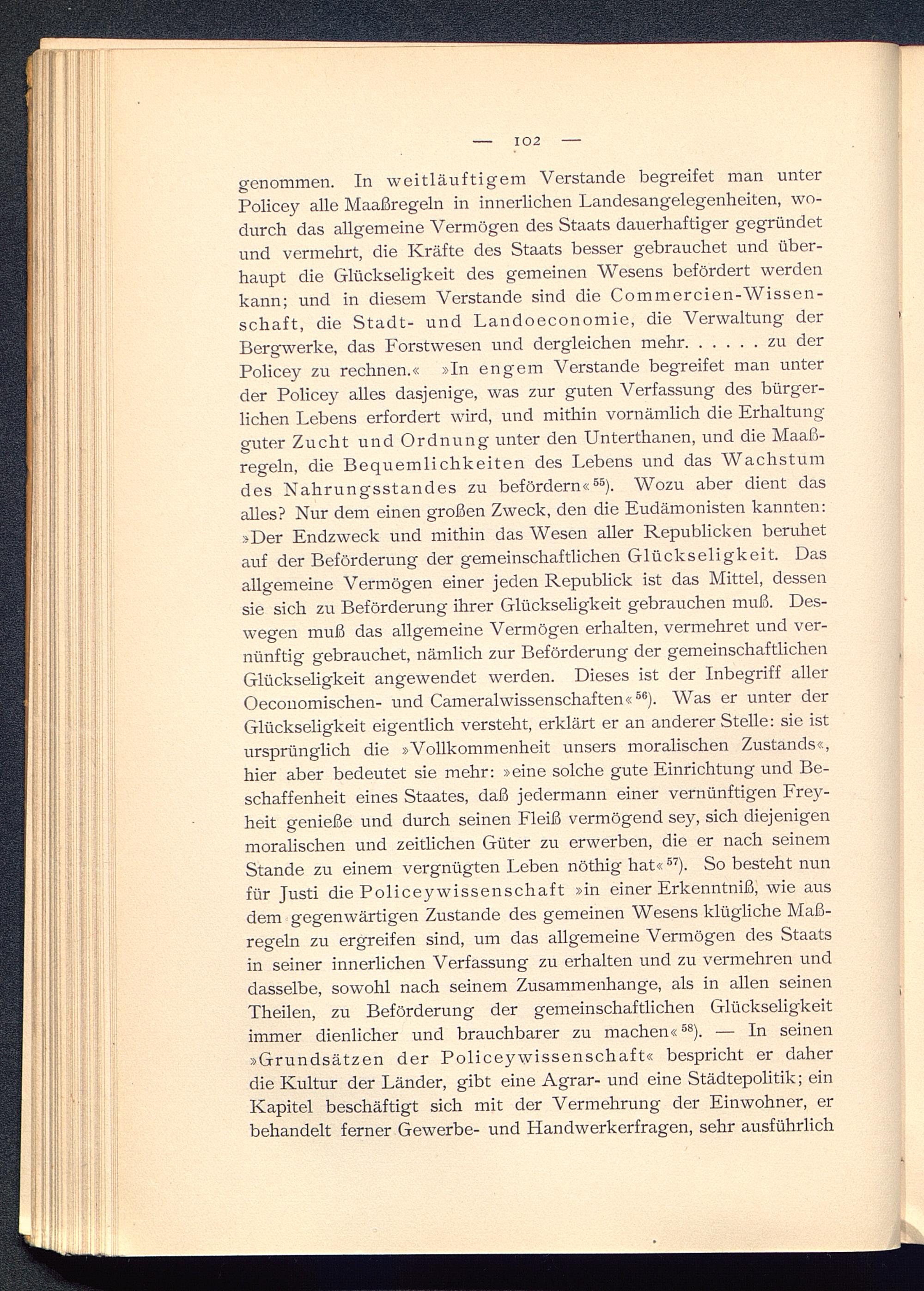 Policey zu rechnen.« »In engem Verstände begreifet man unterder Policey alles dasjenige, was zur guten Verfassung des bürger-lichen Lebens erfordert wird, und mithin vornämlich die Erhaltungguter Zucht und Ordnung unter den Unterthanen, und die Maaß-regeln, die Bequemlichkeiten des Lebens und das Wachstumdes Nahrungsstandes zu befördern« 55 ). Wozu aber dient dasalles? Nur dem einen großen Zweck, den die Eudämonisten kannten:»Der Endzweck und mithin das Wesen aller Republiken beruhetauf der Beförderung der gemeinschaftlichen Glückseligkeit. Dasallgemeine Vermögen einer jeden Republik ist das Mittel, dessensie sich zu Beförderung ihrer Glückseligkeit gebrauchen muß. Des-wegen muß das allgemeine Vermögen erhalten, vermehret und ver-nünftig gebrauchet, nämlich zur Beförderung der gemeinschaftlichenGlückseligkeit angewendet werden. Dieses ist der Inbegriff allerOeconomischen- und CameralWissenschaften« 56 ). Was er unter derGlückseligkeit eigentlich versteht, erklärt er an anderer Stelle: sie istursprünglich die »Vollkommenheit unsers moralischen Zustands«,hier aber bedeutet sie mehr: »eine solche gute Einrichtung und Be-schaffenheit eines Staates, daß jedermann einer vernünftigen Frey-heit genieße und durch seinen Fleiß vermögend sey, sich diejenigenmoralischen und zeitlichen Güter zu erwerben, die er nach seinemStande zu einem vergnügten Leben nöthig hat« 57 ). So besteht nunfür Justi die Policey Wissenschaft »in einer Erkenntniß, wie ausdem gegenwärtigen Zustande des gemeinen Wesens klägliche Maß-regeln zu ergreifen sind, um das allgemeine Vermögen des Staatsin seiner innerlichen Verfassung zu erhalten und zu vermehren unddasselbe, sowohl nach seinem Zusammenhänge, als in allen seinenTheilen, zu Beförderung der gemeinschaftlichen Glückseligkeitimmer dienlicher und brauchbarer zu machen« 58 ). — In seinen»Grundsätzen der Policey Wissenschaft« bespricht er daherdie Kultur der Länder, gibt eine Agrar- und eine Städtepolitik; einKapitel beschäftigt sich mit der Vermehrung der Einwohner, erbehandelt ferner Gewerbe- und Handwerkerfragen, sehr ausführlich
