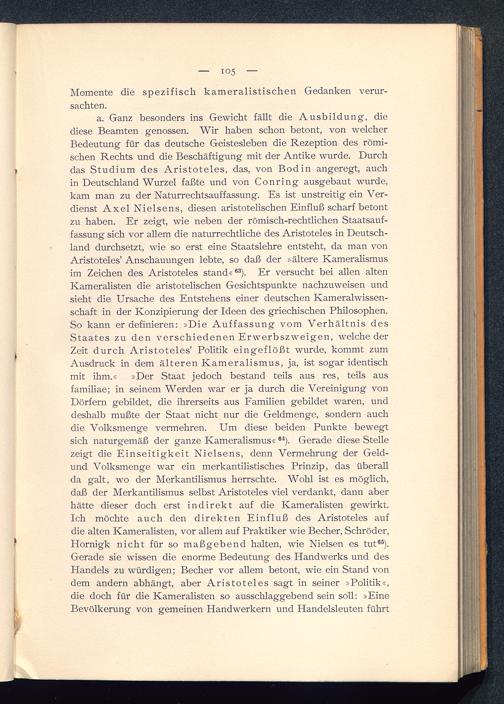 a. Ganz besonders ins Gewicht fällt die Ausbildung, diediese Beamten genossen. Wir haben schon betont, von welcherBedeutung für das deutsche Geistesleben die Rezeption des römi-schen Rechts und die Beschäftigung mit der Antike wurde. Durchdas Studium des Aristoteles, das, von Bodin angeregt, auchin Deutschland Wurzel faßte und von Conring ausgebaut wurde,kam man zu der Naturrechtsauffassung. Es ist unstreitig ein Ver-dienst Axel Nielsens, diesen aristotelischen Einfluß scharf betontzu haben. Er zeigt, wie neben der römisch-rechtlichen Staatsauf-fassung sich vor allem die naturrechtliche des Aristoteles in Deutsch-land durchsetzt, wie so erst eine Staatslehre entsteht, da man vonAristoteles ’ Anschauungen lebte, so daß der »ältere Kameralismusim Zeichen des Aristoteles stand« 83 ). Er versucht bei allen altenKameralisten die aristotelischen Gesichtspunkte nachzuweisen undsieht die Ursache des Entstehens einer deutschen Kameralwissen-schaft in der Konzipierung der Ideen des griechischen Philosophen.So kann er definieren: »Die Auffassung vom Verhältnis desStaates zu den verschiedenen Erwerbszweigen, welche derZeit durch Aristoteles ’ Politik eingeflößt wurde, kommt zumAusdruck in dem älteren Kameralismus, ja, ist sogar identischmit ihm.« »Der Staat jedoch bestand teils aus res, teils ausfamiliae; in seinem Werden war er ja durch die Vereinigung vonDörfern gebildet, die ihrerseits aus Familien gebildet waren, unddeshalb mußte der Staat nicht nur die Geldmenge, sondern auchdie Volksmenge vermehren. Um diese beiden Punkte bewegtsich naturgemäß der ganze Kameralismus« 84 ). Gerade diese Stellezeigt die Einseitigkeit Nielsens, denn Vermehrung der Geld-und Volksmenge war ein merkantilistisches Prinzip, das überallda galt, wo der Merkantilismus herrschte. Wohl ist es möglich,daß der Merkantilismus selbst Aristoteles viel verdankt, dann aberhätte dieser doch erst indirekt auf die Kameralisten gewirkt.Ich möchte auch den direkten Einfluß des Aristoteles aufdie alten Kameralisten, vor allem auf Praktiker wie Becher, Schröder,Hornigk nicht für so maßgebend halten, wie Nielsen es tut 65 ).Gerade sie wissen die enorme Bedeutung des Handwerks und desHandels zu würdigen; Becher vor allem betont, wie ein Stand vondem andern abhängt, aber Aristoteles sagt in seiner »Politik«,die doch für die Kameralisten so ausschlaggebend sein soll: »EineBevölkerung von gemeinen Handwerkern und Handelsleuten führt