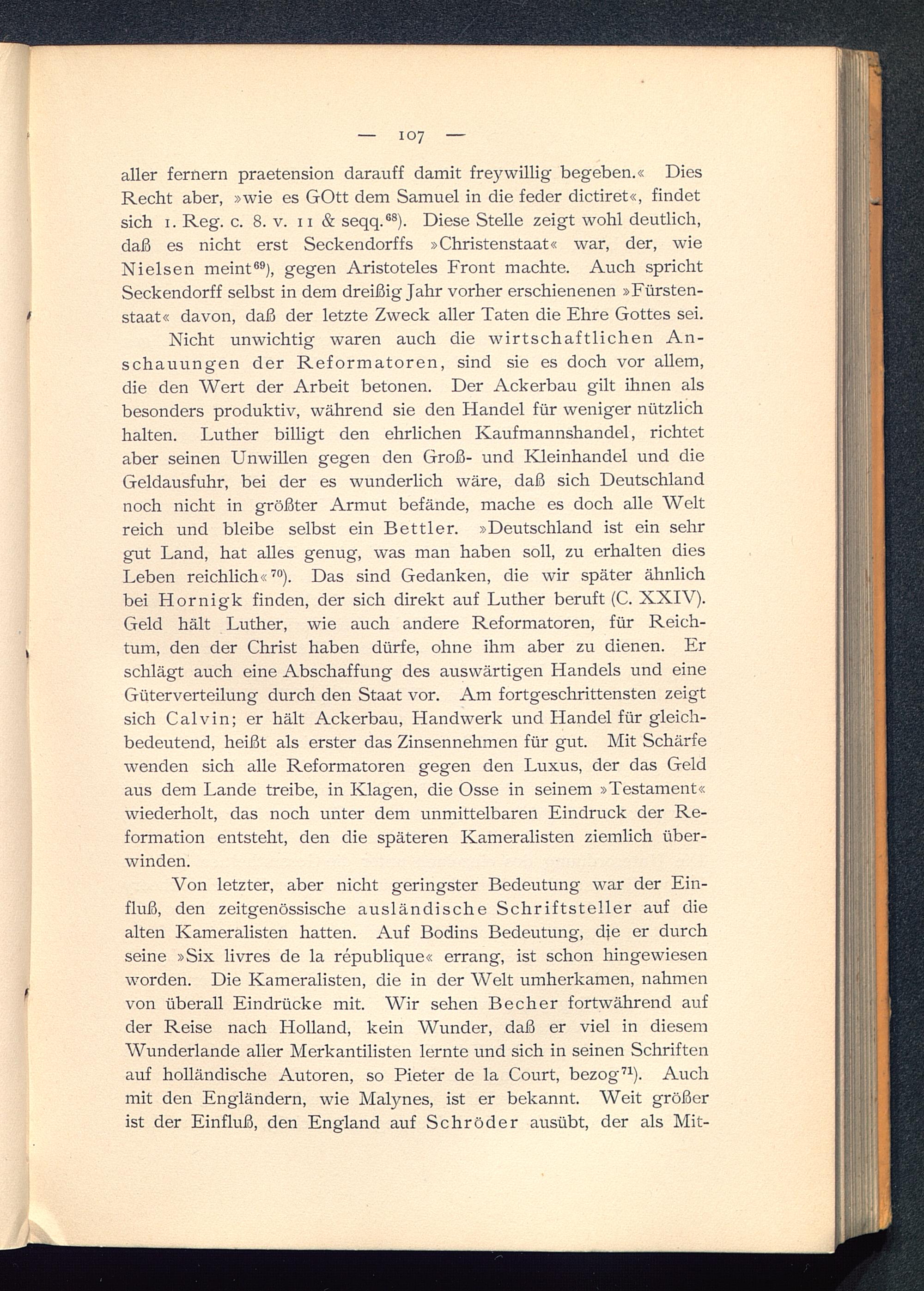 Nicht unwichtig waren auch die wirtschaftlichen An-schauungen der Reformatoren, sind sie es doch vor allem,die den Wert der Arbeit betonen. Der Ackerbau gilt ihnen alsbesonders produktiv, während sie den Handel für weniger nützlichhalten. Luther billigt den ehrlichen Kaufmannshandel, richtetaber seinen Unwillen gegen den Groß- und Kleinhandel und dieGeldausfuhr, bei der es wunderlich wäre, daß sich Deutschland noch nicht in größter Armut befände, mache es doch alle Weltreich und bleibe selbst ein Bettler. »Deutschland ist ein sehrgut Land, hat alles genug, was man haben soll, zu erhalten diesLeben reichlich« 70 ). Das sind Gedanken, die wir später ähnlichbei Hornigk finden, der sich direkt auf Luther beruft (C. XXIV).Geld hält Luther, wie auch andere Reformatoren, für Reich-tum, den der Christ haben dürfe, ohne ihm aber zu dienen. Erschlägt auch eine Abschaffung des auswärtigen Handels und eineGüterverteilung durch den Staat vor. Am fortgeschrittensten zeigtsich Calvin; er hält Ackerbau, Handwerk und Handel für gleich-bedeutend, heißt als erster das Zinsennehmen für gut. Mit Schärfewenden sich alle Reformatoren gegen den Luxus, der das Geldaus dem Lande treibe, in Klagen, die Osse in seinem »Testament «wiederholt, das noch unter dem unmittelbaren Eindruck der Re-formation entsteht, den die späteren Kameralisten ziemlich über-winden.