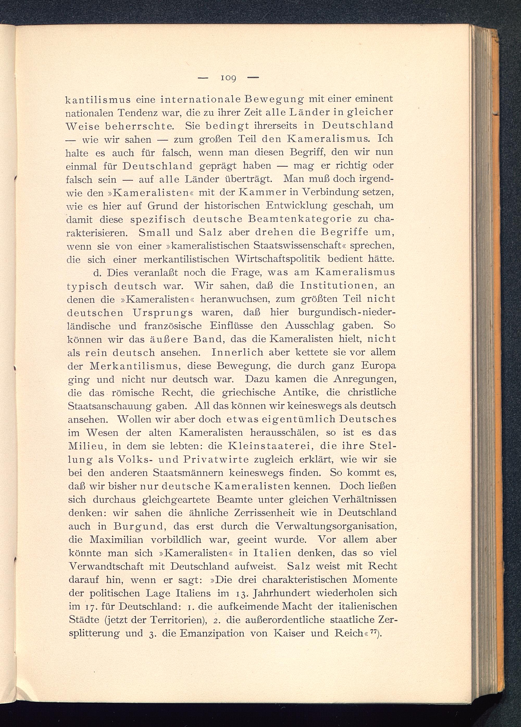 d. Dies veranlaßt noch die Frage, was am Kameralismustypisch deutsch war. Wir sahen, daß die Institutionen, andenen die »Kameralisten« heran wuchsen, zum größten Teil nichtdeutschen Ursprungs waren, daß hier burgundisch-nieder-ländische und französische Einflüsse den Ausschlag gaben. Sokönnen wir das äußere Band, das die Kameralisten hielt, nichtals rein deutsch ansehen. Innerlich aber kettete sie vor allemder Merkantilismus, diese Bewegung, die durch ganz Europa ging und nicht nur deutsch war. Dazu kamen die Anregungen,die das römische Recht, die griechische Antike, die christlicheStaatsanschauung gaben. All das können wir keineswegs als deutsch ansehen. Wollen wir aber doch etwas eigentümlich Deutschesim Wesen der alten Kameralisten herausschälen, so ist es dasMilieu, in dem sie lebten: die Kleinstaaterei, die ihre Stel-lung als Volks- und Privatwirte zugleich erklärt, wie wir siebei den anderen Staatsmännern keineswegs finden. So kommt es,daß wir bisher nur deutsche Kameralisten kennen. Doch ließensich durchaus gleichgeartete Beamte unter gleichen Verhältnissendenken: wir sahen die ähnliche Zerrissenheit wie in Deutschland auch in Burgund , das erst durch die Verwaltungsorganisation,die Maximilian vorbildlich war, geeint wurde. Vor allem aberkönnte man sich »Kameralisten« in Italien denken, das so vielVerwandtschaft mit Deutschland auf weist. Salz weist mit Rechtdarauf hin, wenn er sagt: »Die drei charakteristischen Momenteder politischen Lage Italiens im 13. Jahrhundert wiederholen sichim 17. für Deutschland : 1. die aufkeimende Macht der italienischenStädte (jetzt der Territorien), 2. die außerordentliche staatliche Zer-splitterung und 3. die Emanzipation von Kaiser und Reich« 77 ).