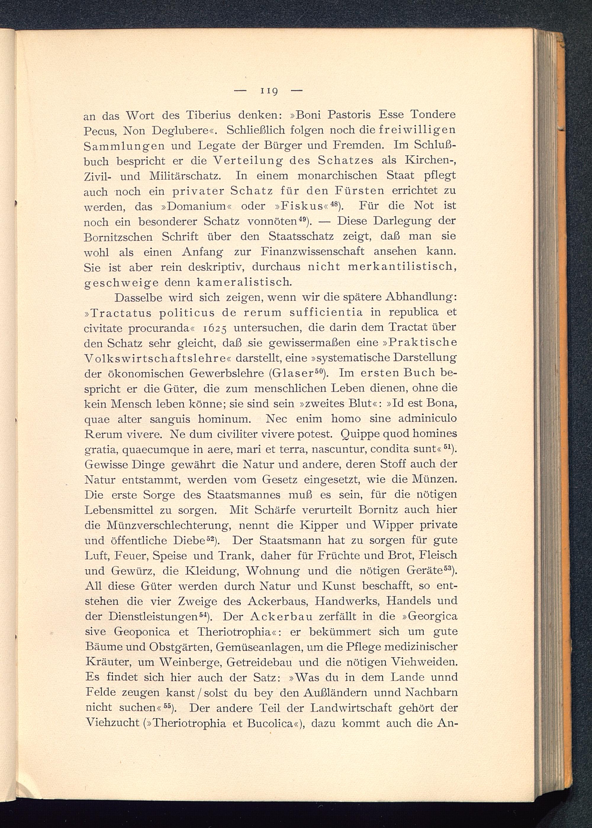 Dasselbe wird sich zeigen, wenn wir die spätere Abhandlung:»Tractatus politicus de rerum sufficientia in republica etcivitate procuranda« 1625 untersuchen, die darin dem Tractat überden Schatz sehr gleicht, daß sie gewissermaßen eine »PraktischeVolkswirtschaftslehre« darstellt, eine »systematische Darstellungder ökonomischen Gewerbslehre (Glaser 50 ). Im ersten Buch be-spricht er die Güter, die zum menschlichen Leben dienen, ohne diekein Mensch leben könne; sie sind sein »zweites Blut«: »Id est Bona,quae alter sanguis hominum. Nec enim homo sine adminiculoRerum vivere. Ne dum civiliter vivere potest. Quippe quod hominesgratia, quaecumque in aere, mari et terra, nascuntur, condita sunt« 61 ).Gewisse Dinge gewährt die Natur und andere, deren Stoff auch derNatur entstammt, werden vom Gesetz eingesetzt, wie die Münzen.Die erste Sorge des Staatsmannes muß es sein, für die nötigenLebensmittel zu sorgen. Mit Schärfe verurteilt Bornitz auch hierdie Münzverschlechterung, nennt die Kipper und Wipper privateund öffentliche Diebe 52 ). Der Staatsmann hat zu sorgen für guteLuft, Feuer, Speise und Trank, daher für Früchte und Brot, Fleischund Gewürz, die Kleidung, Wohnung und die nötigen Geräte 63 ).All diese Güter werden durch Natur und Kunst beschafft, so ent-stehen die vier Zweige des Ackerbaus, Handwerks, Handels undder Dienstleistungen 54 ). Der Ackerbau zerfällt in die »Georgicasive Geoponica et Theriotrophia«: er bekümmert sich um guteBäume und Obstgärten, Gemüseanlagen, um die Pflege medizinischerKräuter, um Weinberge, Getreidebau und die nötigen Viehweiden.Es findet sich hier auch der Satz: »Was du in dem Lande unndFelde zeugen kanst/solst du bey den Außländern unnd Nachbarnnicht suchen« 55 ). Der andere Teil der Landwirtschaft gehört derViehzucht (»Theriotrophia et Bucolica«), dazu kommt auch die An-