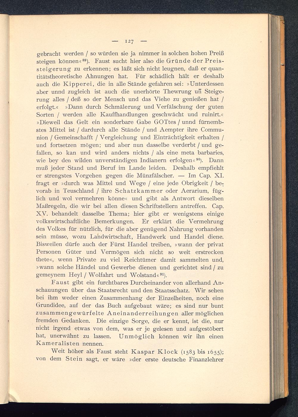 gebracht werden / so würden sie ja nimmer in solchen hohen Preißsteigen können« 89 ). Faust sucht hier also die Gründe der Preis-steigerung zu erkennen; es läßt sich nicht leugnen, daß er quan-titätstheoretische Ahnungen hat. Für schädlich hält er deshalbauch die Kipperei, die in alle Stände gefahren sei: »Unterdessenaber unnd zugleich ist auch die unerhörte Thewrung uh Steige-rung alles / deß so der Mensch und das Viehe zu genießen hat /erfolgt.« »Dann durch Schmälerung und Verfälschung der gutenSorten / werden alle Kaufhandlungen geschwächt und ruinirt.«»Dieweil das Gelt ein sonderbare Gabe GOTtes / unnd fürnemb-stes Mittel ist / dardurch alle Stände / und Aempter ihre Commu-nion / Gemeinschafft / Vergleichung und Einträchtigkeit erhalten /und fortsetzen mögen; und aber nun dasselbe verderbt / und ge-fallen, so kan und wird anders nichts / als eine meta barbaries,wie bey den wilden unverständigen Indianern erfolgen« 90 ). Dannmuß jeder Stand und Beruf im Lande leiden. Deshalb empfiehlter strengstes Vorgehen gegen die Münzfälscher. — Im Cap. XI.fragt er »durch was Mittel und Wege / eine jede Obrigkeit / be-vorab in Teuschland / ihre Schatzkammer oder Aerarium, füg-lich und wol vermehren könne« und gibt als Antwort dieselbenMaßregeln, die wir bei allen diesen Schriftstellern antreffen. Cap.XV. behandelt dasselbe Thema; hier gibt er wenigstens einigevolkswirtschaftliche Bemerkungen. Er erklärt die Vermehrungdes Volkes für nützlich, für die aber genügend Nahrung vorhandensein müsse, wozu Landwirtschaft, Handwerk und Handel diene.Bisweilen dürfe auch der Fürst Handel treiben, »wann der privatPersonen Güter und Vermögen sich nicht so weit erstreckenthete«, wenn Private zu viel Reichtümer damit sammelten und,»wann solche Händel und Gewerbe dienen und gerichtet sind / zugemeynem Heyl / Wolfahrt und Wolstand« 91 ).