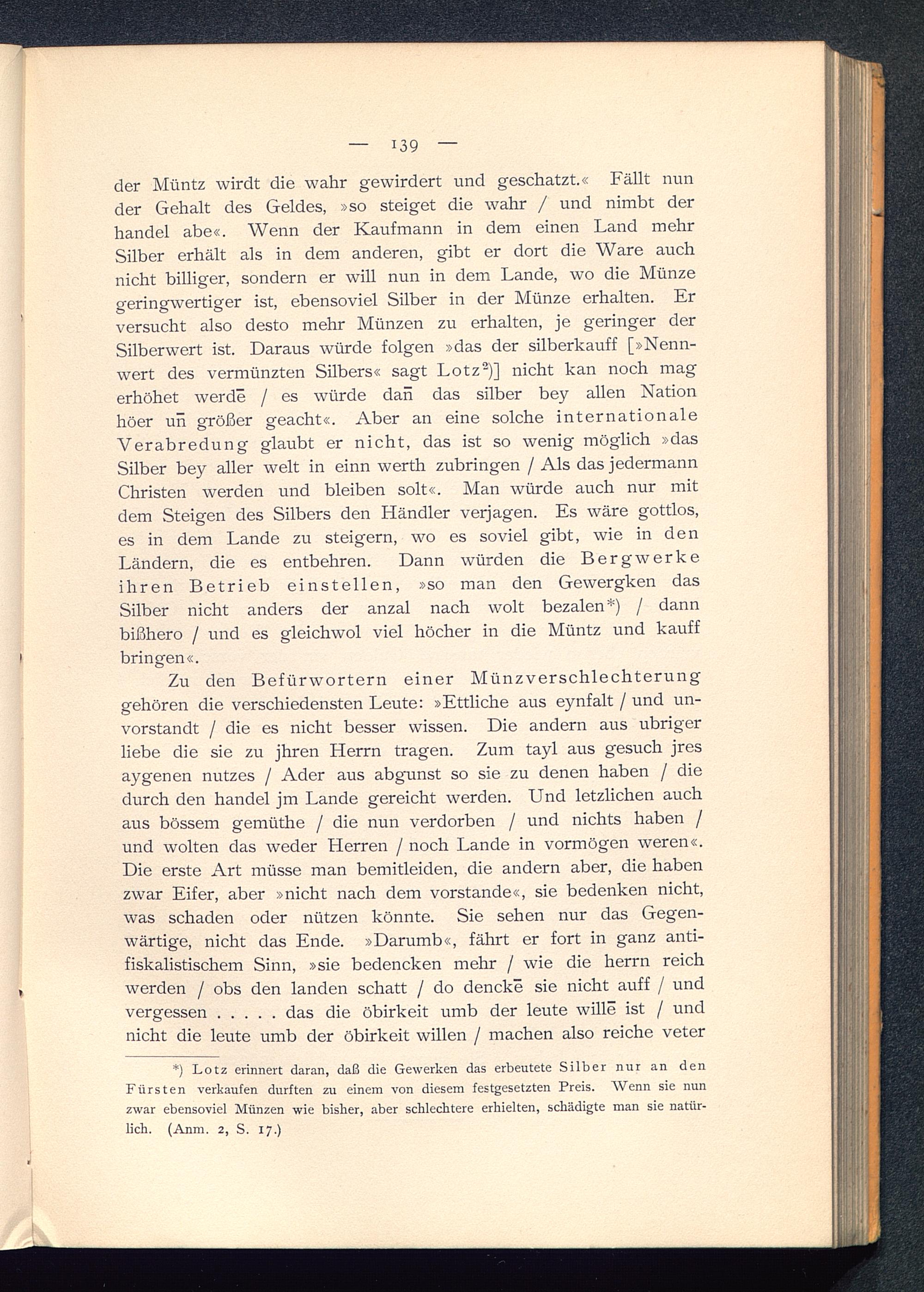 *) Lotz erinnert daran, daß die Gewerken das erbeutete Silber nur an denFürsten verkaufen durften zu einem von diesem festgesetzten Preis. Wenn sie nunzwar ebensoviel Münzen wie bisher, aber schlechtere erhielten, schädigte man sie natür-lich. (Anm. 2, S. 17.)