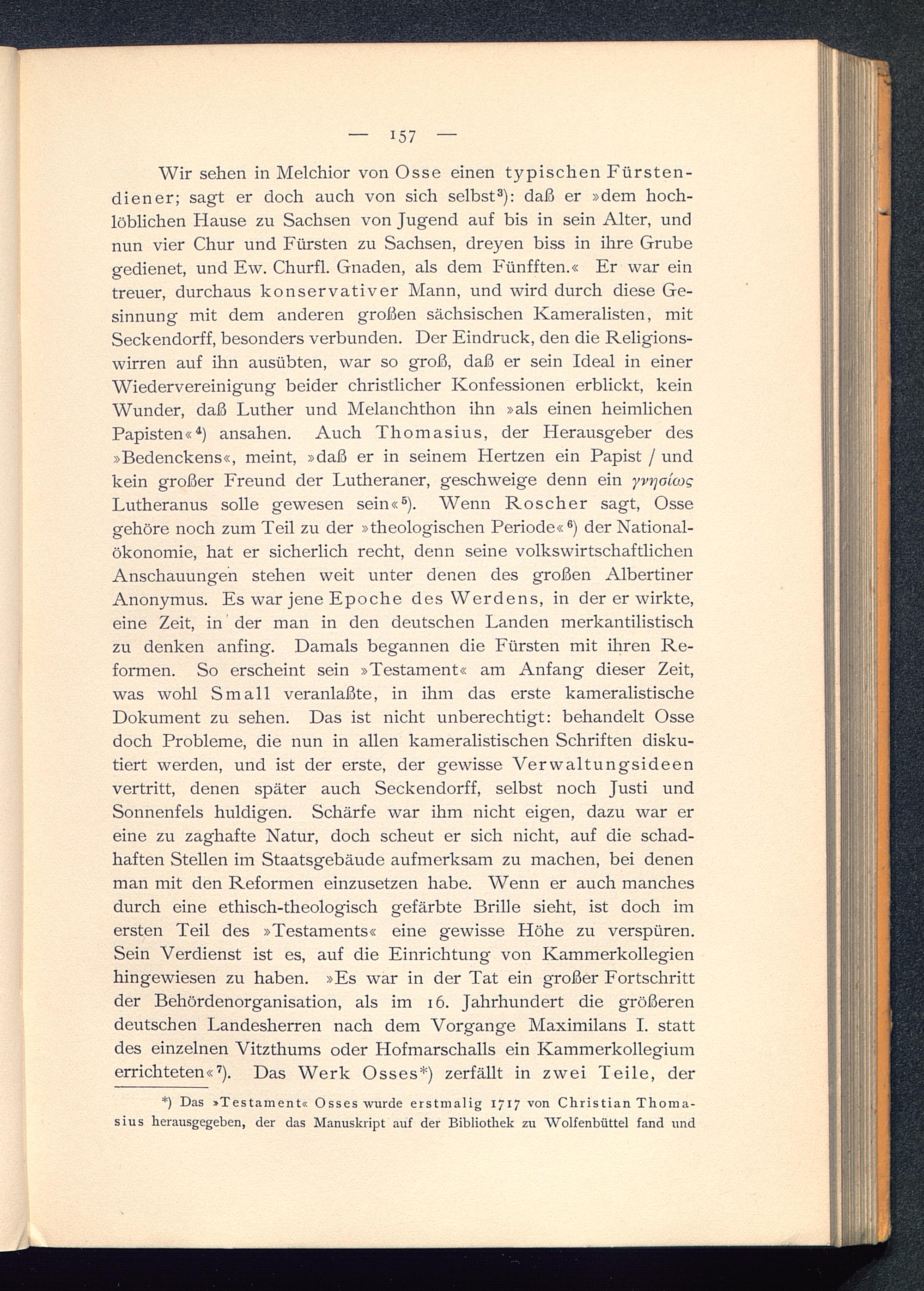 Wir sehen in Melchior von Osse einen typischen Fürsten-diener; sagt er doch auch von sich selbst 3 ): daß er »dem hoch-löblichen Hause zu Sachsen von Jugend auf bis in sein Alter, undnun vier Chur und Fürsten zu Sachsen, dreyen biss in ihre Grubegedienet, und Ew. Churfl. Gnaden, als dem Fünfften.« Er war eintreuer, durchaus konservativer Mann, und wird durch diese Ge-sinnung mit dem anderen großen sächsischen Kameralisten, mitSeckendorff, besonders verbunden. Der Eindruck, den die Religions-wirren auf ihn ausübten, war so groß, daß er sein Ideal in einerWiedervereinigung beider christlicher Konfessionen erblickt, keinWunder, daß Luther und Melanchthon ihn »als einen heimlichenPapisten« 4 ) ansahen. Auch Thomasius , der Herausgeber des»Bedenckens«, meint, »daß er in seinem Hertzen ein Papist / undkein großer Preund der Lutheraner, geschweige denn ein yvrjoicogLutheranus solle gewesen sein« 5 ). Wenn Roscher sagt, Ossegehöre noch zum Teil zu der »theologischen Periode« 6 ) der National-ökonomie, hat er sicherlich recht, denn seine volkswirtschaftlichenAnschauungen stehen weit unter denen des großen AlbertinerAnonymus. Es war jene Epoche des Werdens, in der er wirkte,eine Zeit, in der man in den deutschen Landen merkantilistischzu denken anfing. Damals begannen die Fürsten mit ihren Re-formen. So erscheint sein »Testament « am Anfang dieser Zeit,was wohl Small veranlaßte, in ihm das erste kameralistischeDokument zu sehen. Das ist nicht unberechtigt: behandelt Ossedoch Probleme, die nun in allen kameralistischen Schriften disku-tiert werden, und ist der erste, der gewisse Verwaltungsideenvertritt, denen später auch Seckendorff , selbst noch Justi undSonnenfels huldigen. Schärfe war ihm nicht eigen, dazu war ereine zu zaghafte Natur, doch scheut er sich nicht, auf die schad-haften Stellen im Staatsgebäude aufmerksam zu machen, bei denenman mit den Reformen einzusetzen habe. Wenn er auch manchesdurch eine ethisch-theologisch gefärbte Brille sieht, ist doch imersten Teil des »Testaments « eine gewisse Höhe zu verspüren.Sein Verdienst ist es, auf die Einrichtung von Kammerkollegienhingewiesen zu haben. »Es war in der Tat ein großer Fortschrittder Behördenorganisation, als im 16. Jahrhundert die größerendeutschen Landesherren nach dem Vorgänge Maximilans I. stattdes einzelnen Vitzthums oder Hofmarschalls ein Kammerkollegiumerrichteten« 7 ). Das Werk Osses*) zerfällt in zwei Teile, der