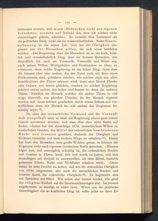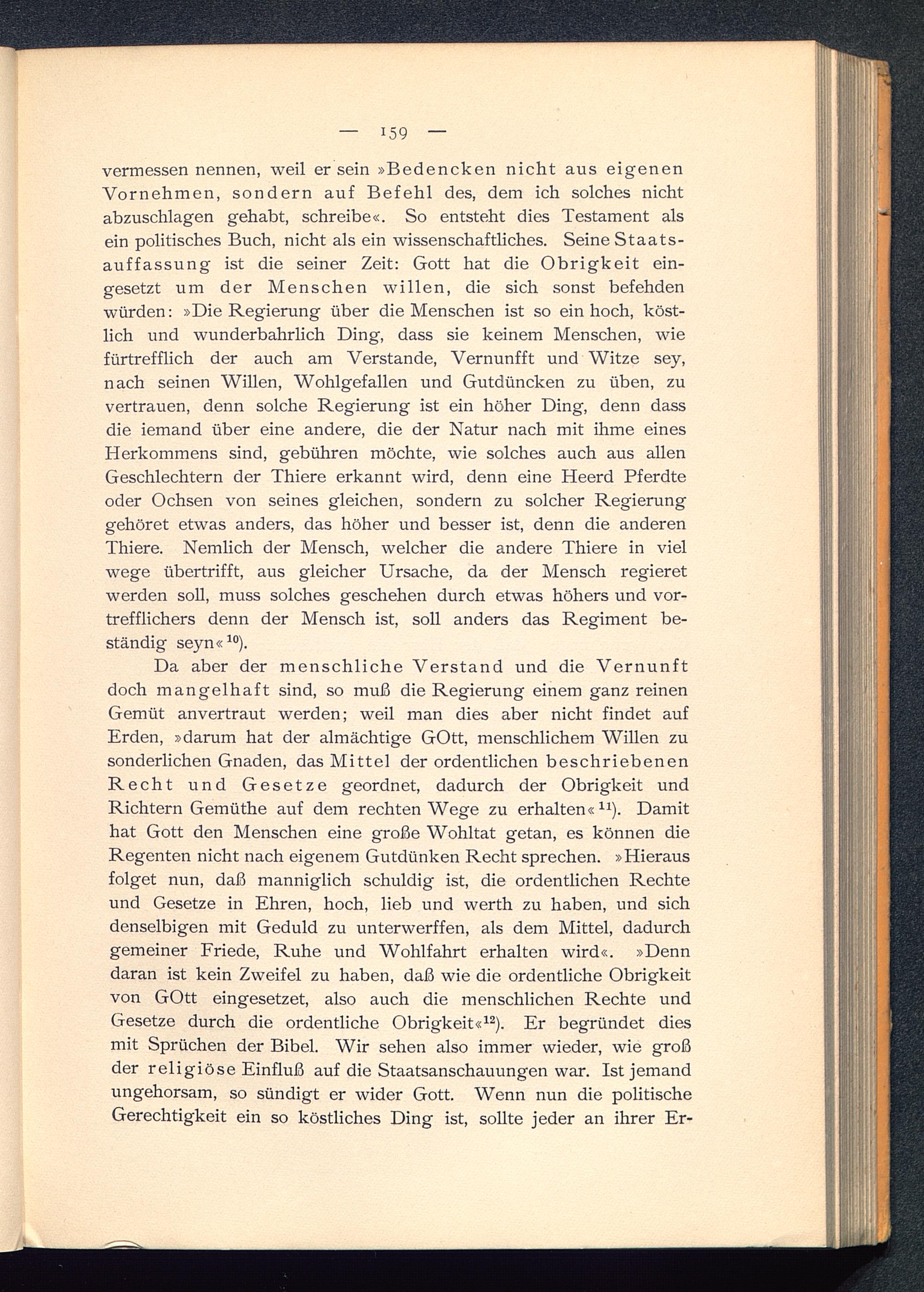 vermessen nennen, weil er sein »Bedencken nicht aus eigenenVornehmen, sondern auf Befehl des, dem ich solches nichtabzuschlagen gehabt, schreibe«. So entsteht dies Testament alsein politisches Buch, nicht als ein wissenschaftliches. Seine Staats-auffassung ist die seiner Zeit: Gott hat die Obrigkeit ein-gesetzt um der Menschen willen, die sich sonst befehdenwürden: »Die Regierung über die Menschen ist so ein hoch, köst-lich und wunderbahrlich Ding, dass sie keinem Menschen, wiefürtrefflich der auch am Verstände, Vernunfft und Witze sey,nach seinen Willen, Wohlgefallen und Gutdüncken zu üben, zuvertrauen, denn solche Regierung ist ein höher Ding, denn dassdie iemand über eine andere, die der Natur nach mit ihme einesHerkommens sind, gebühren möchte, wie solches auch aus allenGeschlechtern der Thiere erkannt wird, denn eine Heerd Pferdteoder Ochsen von seines gleichen, sondern zu solcher Regierunggehöret etwas anders, das höher und besser ist, denn die anderenThiere. Nemlich der Mensch, welcher die andere Thiere in vielwege übertrifft, aus gleicher Ursache, da der Mensch regieretwerden soll, muss solches geschehen durch etwas höhers und vor-trefflichers denn der Mensch ist, soll anders das Regiment be-ständig seyn« 10 ).