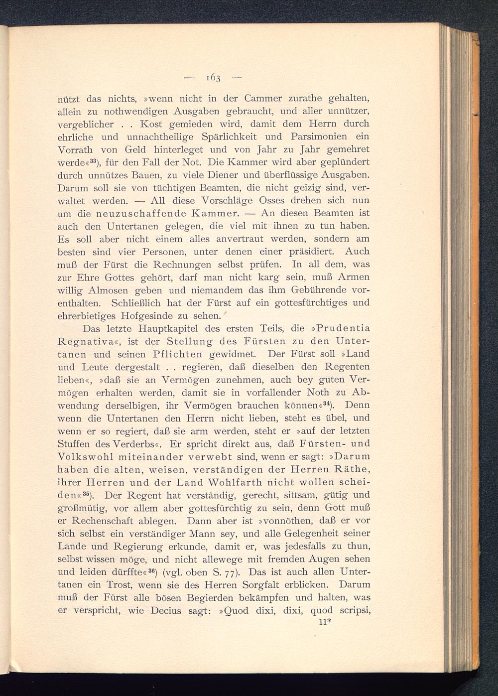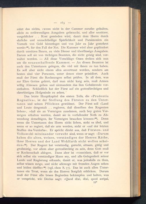 Das letzte Hauptkapitel des ersten Teils, die »PrudentiaRegnativa«, ist der Stellung des Fürsten zu den Unter-tanen und seinen Pflichten gewidmet. Der Fürst soll »Landund Leute dergestalt . . regieren, daß dieselben den Regentenlieben«, »daß sie an Vermögen zunehmen, auch bey guten Ver-mögen erhalten werden, damit sie in vorfallender Noth zu Ab-wendung derselbigen, ihr Vermögen brauchen können« 34 ). Dennwenn die Untertanen den Herrn nicht lieben, steht es übel, undwenn er so regiert, daß sie arm werden, steht er »auf der letztenStuffen des Verderbs«. Er spricht direkt aus, daß Fürsten - undVolkswohl miteinander verwebt sind, wenn er sagt: »Darumhaben die alten, weisen, verständigen der Herren Räthe,ihrer Herren und der Land Wohlfartli nicht wollen schei-den« 36 ). Der Regent hat verständig, gerecht, sittsam, gütig undgroßmütig, vor allem aber gottesfiirchtig zu sein, denn Gott mußer Rechenschaft ablegen. Dann aber ist »vonnöthen, daß er vorsich selbst ein verständiger Mann sey, und alle Gelegenheit seinerLande und Regierung erkunde, damit er, was jedesfalls zu thun,selbst wissen möge, und nicht allewege mit fremden Augen sehenund leiden dürffte« 36 ) (vgl. oben S. 77). Das ist auch allen Unter-tanen ein Trost, wenn sie des Herren Sorgfalt erblicken. Darummuß der Fürst alle bösen Begierden bekämpfen und halten, waser verspricht, wie Decius sagt: »Quod dixi, dixi, quod scripsi,