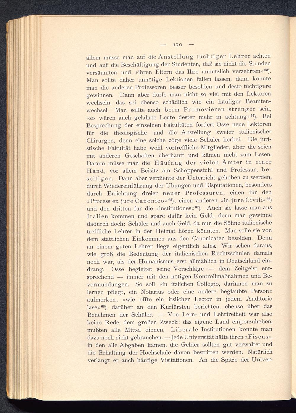 allem müsse man auf die Anstellung tüchtiger Lehrer achtenund auf die Beschäftigung der Studenten, daß sie nicht die Stundenversäumten und »ihren Eltern das Ihre unnützlich verzehrten« 83 ).Man sollte daher unnötige Lektionen fallen lassen, dann könnteman die anderen Professoren besser besolden und desto tüchtigeregewinnen. Dann aber dürfe man nicht so viel mit den Lektorenwechseln, das sei ebenso schädlich wie ein häufiger Beamten-wechsel. Man sollte auch beim Promovieren strenger sein,»so wären auch gelahrte Leute dester mehr in achtung« 64 ). BeiBesprechung der einzelnen Fakultäten fordert Osse neue Lektorenfür die theologische und die Anstellung zweier italienischerChirurgen, denn eine solche zöge viele Schüler herbei. Die juri-stische Fakultät habe wohl vortreffliche Mitglieder, aber die seienmit anderen Geschäften überhäuft und kämen nicht zum Lesen.Darum müsse man die Häufung der vielen Ämter in einerHand, vor allem Beisitz am Schöppenstuhl und Professur, be-seitigen. Dann aber verdiente der Unterricht gehoben zu werden,durch Wiedereinführung der Übungen und Disputationen, besondersdurch Errichtung dreier neuer Professuren, einen für den»Process ex jure Canonico« 66 ), einen anderen »in jure Civili« 86 )und den dritten für die »institutiones« 87 ). Auch sie lasse man ausItalien kommen und spare dafür kein Geld, denn man gewinnedadurch doch: Schüler und auch Geld, da nun die Söhne italienischetreffliche Lehrer in der Heimat hören könnten. Man solle sie vondem stattlichen Einkommen aus den Canonicaten besolden. Dennan einem guten Lehrer liege eigentlich alles. Wir sehen daraus,wie groß die Bedeutung der italienischen Rechtsschulen damalsnoch war, als der Humanismus erst allmählich in Deutschland ein-drang. Osse begleitet seine Vorschläge — dem Zeitgeist ent-sprechend — immer mit den nötigen Kontrollmaßnahmen und Be-vormundungen. So soll »in itzlichen Collegio, darinnen man zulernen pflegt, ein Notarius oder eine andere beglaubte Person«aufmerken, »wie offte ein itzlicher Lector in jedem Auditorioläse« 88 ), darüber an den Kurfürsten berichten, ebenso über dasBenehmen der Schüler. — Von Lern- und Lehrfreiheit war alsokeine Rede, dem großen Zweck: das eigene Land emporzuheben,mußten alle Mittel dienen. Liberale Institutionen konnte mandazu noch nicht gebrauchen.—Jede Universität hätte ihren »Fiscus«,in den alle Abgaben kämen, die Gelder sollten gut verwaltet unddie Erhaltung der Hochschule davon bestritten werden. Natürlichverlangt er auch häufige Visitationen. An die Spitze der Univer-