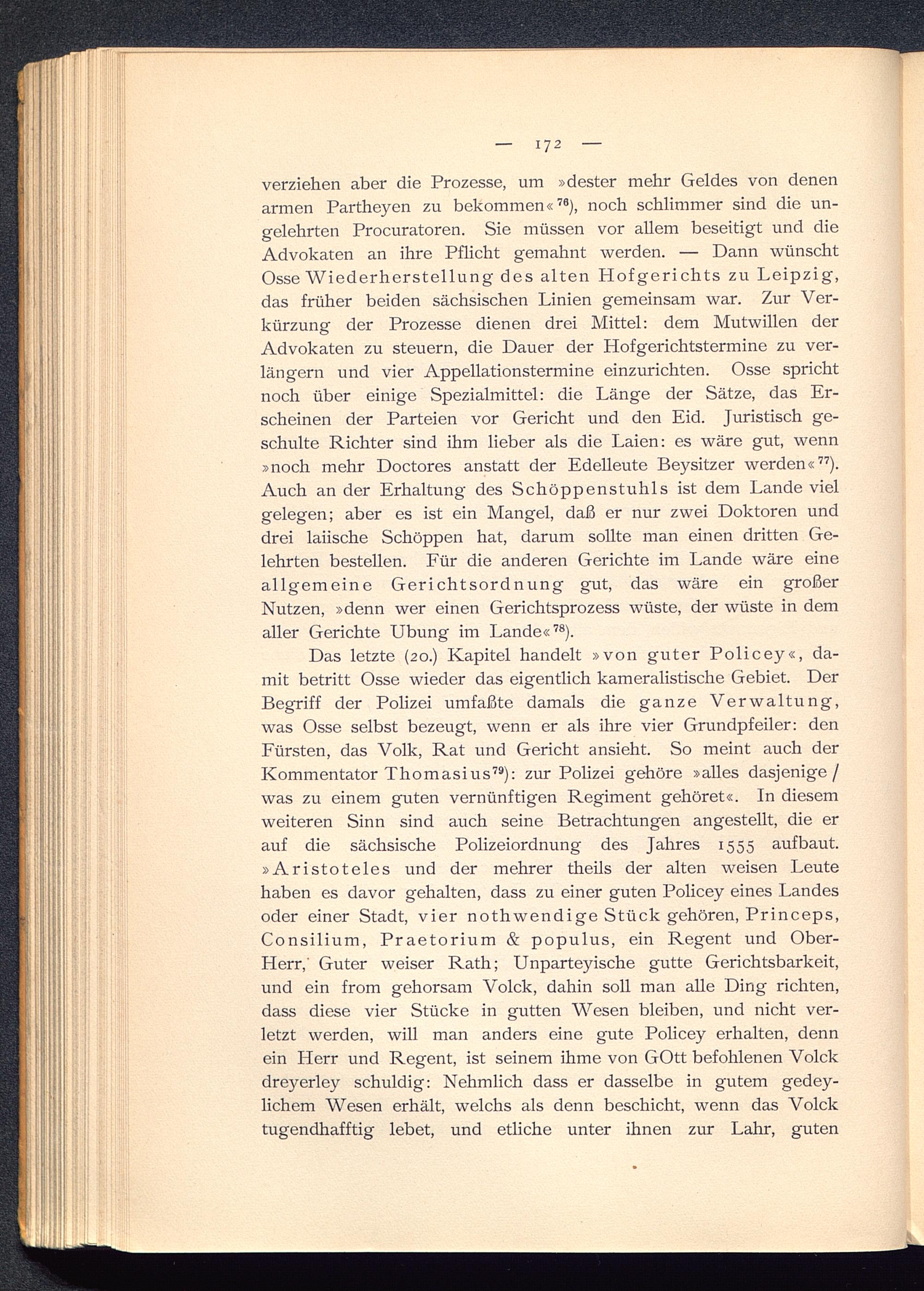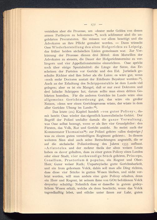 Das letzte (20.) Kapitel handelt »von guter Policey«, da-mit betritt Osse wieder das eigentlich kameralistische Gebiet. DerBegriff der Polizei umfaßte damals die ganze Verwaltung,was Osse selbst bezeugt, wenn er als ihre vier Grundpfeiler: denFürsten , das Volk, Rat und Gericht ansieht. So meint auch derKommentator Thomasius 79 ): zur Polizei gehöre »alles dasjenige/was zu einem guten vernünftigen Regiment gehöret«. In diesemweiteren Sinn sind auch seine Betrachtungen angestellt, die erauf die sächsische Polizeiordnung des Jahres 1555 auf baut.»Aristoteles und der mehrer theils der alten weisen Leutehaben es davor gehalten, dass zu einer guten Policey eines Landesoder einer Stadt, vier nothwendige Stück gehören, Princeps,Consilium, Praetorium & populus, ein Regent und Ober-Herr,' Guter weiser Rath; Unparteyische gutte Gerichtsbarkeit,und ein from gehorsam Volck, dahin soll man alle Ding richten,dass diese vier Stücke in gutten Wesen bleiben, und nicht ver-letzt werden, will man anders eine gute Policey erhalten, dennein Herr und Regent, ist seinem ihme von GOtt befohlenen Volckdreyerley schuldig: Nehmlich dass er dasselbe in gutem gedey-lichem Wesen erhält, welchs als denn beschicht, wenn das Volcktugendhafftig lebet, und etliche unter ihnen zur Lahr , guten