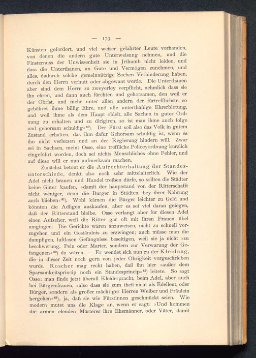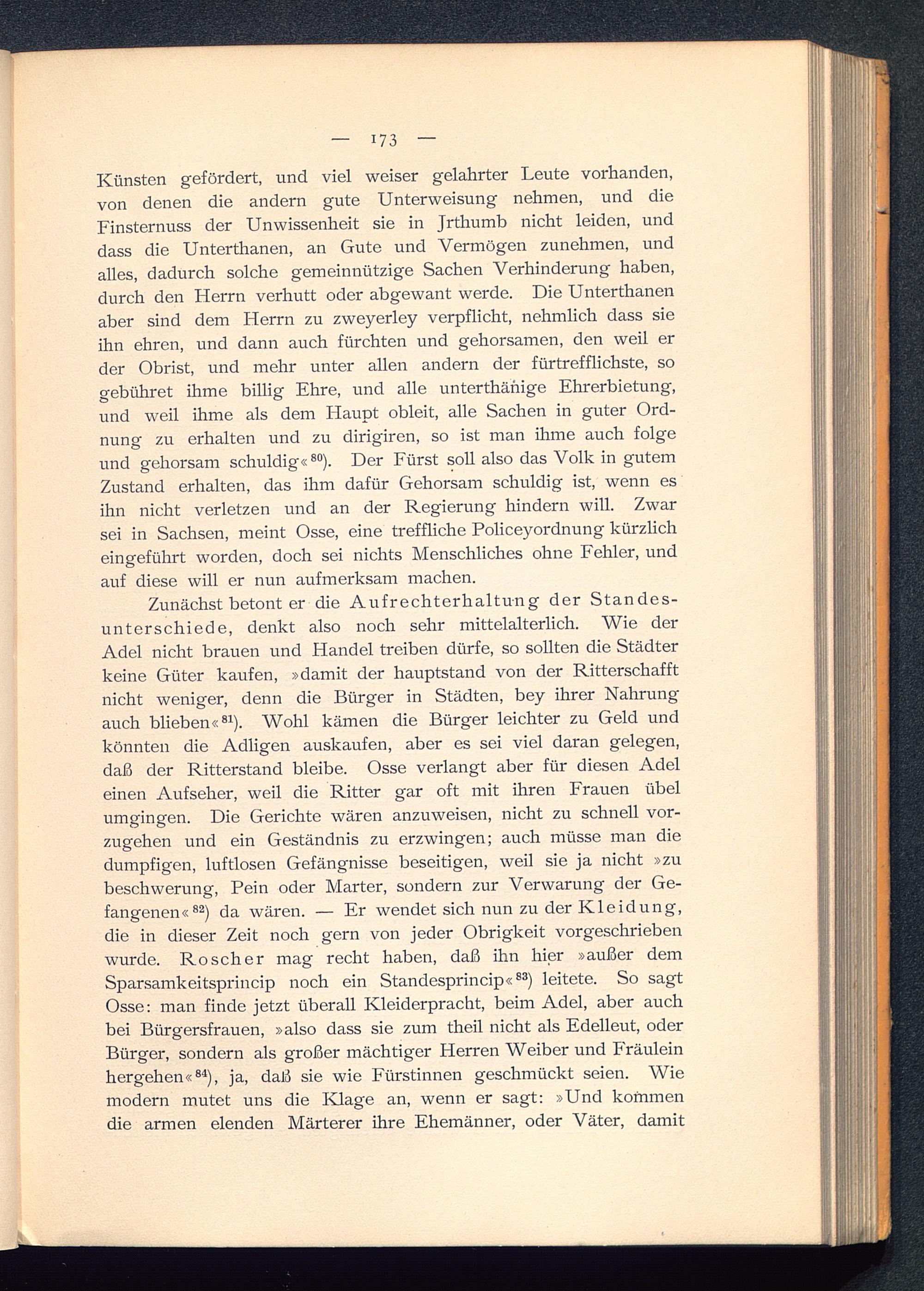 Zunächst betont er die Aufrechterhaltung der Standes-unterschiede, denkt also noch sehr mittelalterlich. Wie derAdel nicht brauen und Handel treiben dürfe, so sollten die Städterkeine Güter kaufen, »damit der hauptstand von der Ritterschafftnicht weniger, denn die Bürger in Städten, bey ihrer Nahrungauch blieben« 81 ). Wohl kämen die Bürger leichter zu Geld undkönnten die Adligen auskaufen, aber es sei viel daran gelegen,daß der Ritterstand bleibe. Osse verlangt aber für diesen Adeleinen Aufseher, weil die Ritter gar oft mit ihren Frauen übelumgingen. Die Gerichte wären anzuweisen, nicht zu schnell vor-zugehen und ein Geständnis zu erzwingen; auch müsse man diedumpfigen, luftlosen Gefängnisse beseitigen, weil sie ja nicht »zubeschwerung, Pein oder Marter, sondern zur Verwarung der Ge-fangenen« 82 ) da wären. — Er wendet sich nun zu der Kleidung,die in dieser Zeit noch gern von jeder Obrigkeit vorgeschriebenwurde. Roscher mag recht haben, daß ihn hier »außer demSparsamkeitsprincip noch ein Standesprincip« 83 ) leitete. So sagtOsse: man finde jetzt überall Kleiderpracht, beim Adel, aber auchbei Bürgersfrauen, »also dass sie zum theil nicht als Edelleut, oderBürger, sondern als großer mächtiger Herren Weiber und Fräuleinhergehen« 84 ), ja, daß sie wie Fürstinnen geschmückt seien. Wiemodern mutet uns die Klage an, wenn er sagt: »Und kommendie armen elenden Märterer ihre Ehemänner, oder Väter, damit