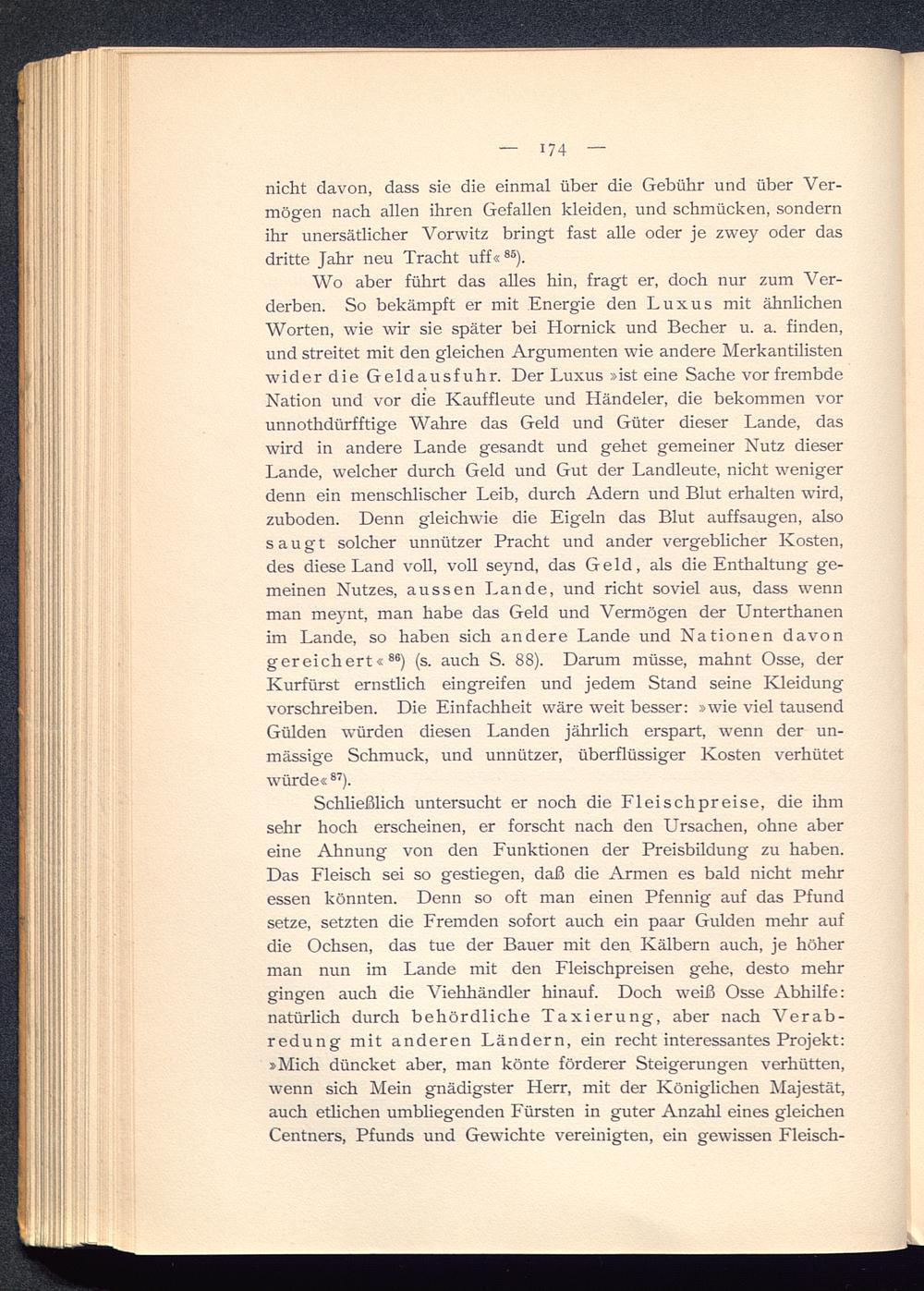 Wo aber führt das alles hin, fragt er, doch nur zum Ver-derben. So bekämpft er mit Energie den Luxus mit ähnlichenWorten, wie wir sie später bei Hornick und Becher u. a. finden,und streitet mit den gleichen Argumenten wie andere Merkantilistenwider die Geldausfuhr. Der Luxus »ist eine Sache vor frembdeNation und vor die Kauffleute und Händeler, die bekommen vorunnothdürfftige Wahre das Geld und Güter dieser Lande, daswird in andere Lande gesandt und gehet gemeiner Nutz dieserLande, welcher durch Geld und Gut der Landleute, nicht wenigerdenn ein menschlischer Leib, durch Adern und Blut erhalten wird,zuboden. Denn gleichwie die Eigeln das Blut auffsaugen, alsosaugt solcher unnützer Pracht und ander vergeblicher Kosten,des diese Land voll, voll seynd, das Geld, als die Enthaltung ge-meinen Nutzes, aussen Lande, und rieht soviel aus, dass wennman meynt, man habe das Geld und Vermögen der Unterthanenim Lande, so haben sich andere Lande und Nationen davongereichert« 86 ) (s. auch S. 88). Darum müsse, mahnt Osse, derKurfürst ernstlich eingreifen und jedem Stand seine Kleidungvorschreiben. Die Einfachheit wäre weit besser: »wie viel tausendGülden -würden diesen Landen jährlich erspart, wenn der un-mässige Schmuck, und unnützer, überflüssiger Kosten verhütetwürde« 87 ).
