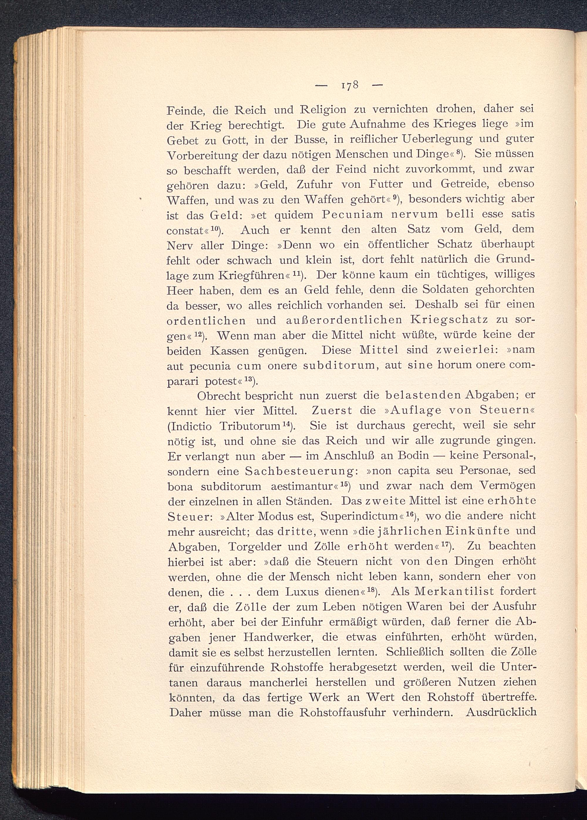 Obrecht bespricht nun zuerst die belastenden Abgaben; erkennt hier vier Mittel. Zuerst die »Auflage von Steuern«(Indictio Tributorum 14 ). Sie ist durchaus gerecht, weil sie sehrnötig ist, und ohne sie das Reich und wir alle zugrunde gingen.Er verlangt nun aber — im Anschluß an Bodin — keine Personal-,sondern eine Sachbesteuerung: »non capita seu Personae, sedbona subditorum aestimantur« 15 ) und zwar nach dem Vermögender einzelnen in allen Ständen. Das zweite Mittel ist eine erhöhteSteuer: »Alter Modus est, Superindictum« 16 ), wo die andere nichtmehr ausreicht; das dritte, wenn »die jährlichen Einkünfte undAbgaben, Torgelder und Zölle erhöht werden« 17 ). Zu beachtenhierbei ist aber: »daß die Steuern nicht von den Dingen erhöhtwerden, ohne die der Mensch nicht leben kann, sondern eher vondenen, die . . . dem Luxus dienen« 18 ). Als Merkantilist forderter, daß die Zölle der zum Leben nötigen Waren bei der Ausfuhrerhöht, aber bei der Einfuhr ermäßigt würden, daß ferner die Ab-gaben jener Handwerker, die etwas einführten, erhöht würden,damit sie es selbst herzustellen lernten. Schließlich sollten die Zöllefür einzuführende Rohstoffe herabgesetzt werden, weil die Unter-tanen daraus mancherlei hersteilen und größeren Nutzen ziehenkönnten, da das fertige Werk an Wert den Rohstoff übertreffe.Daher müsse man die Rohstoffausfuhr verhindern. Ausdrücklich