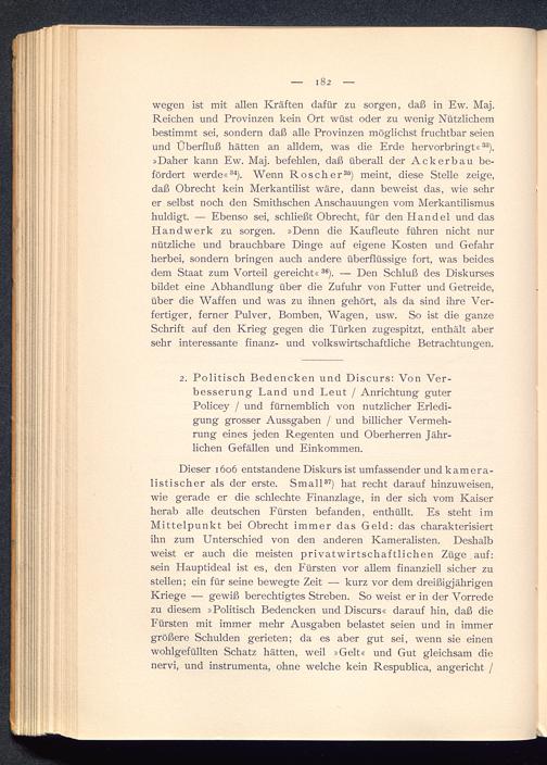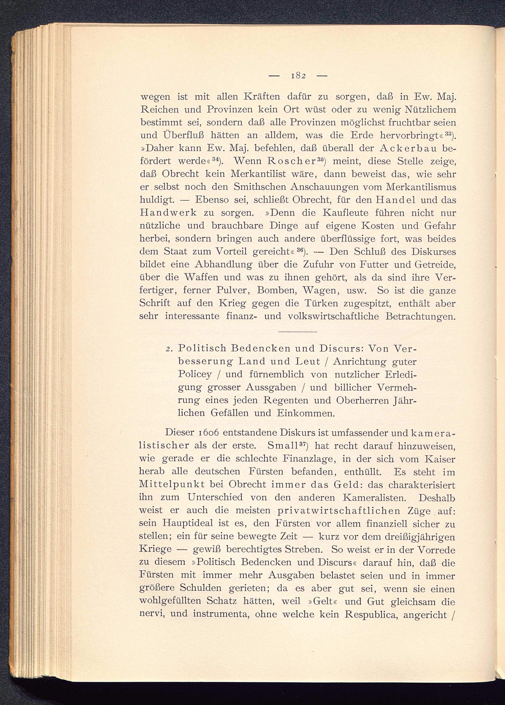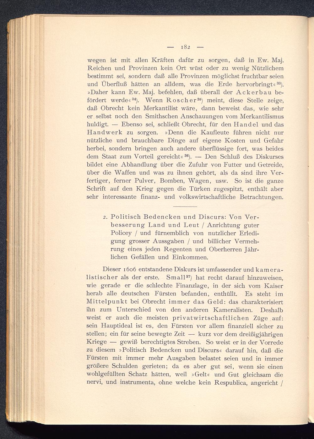 wegen ist mit allen Kräften dafür zu sorgen, daß in Ew. Maj.Reichen und Provinzen kein Ort wüst oder zu wenig Nützlichembestimmt sei, sondern daß alle Provinzen möglichst fruchtbar seienund Überfluß hätten an alldem, was die Erde hervorbringt« 33 ).»Daher kann Ew. Maj. befehlen, daß überall der Ackerbau be-fördert werde« 34 ). Wenn Roscher 38 ) meint, diese Stelle zeige,daß Obrecht kein Merkantilist wäre, dann beweist das, wie sehrer selbst noch den Smithschen Anschauungen vom Merkantilismushuldigt. — Ebenso sei, schließt Obrecht, für den Handel und dasHandwerk zu sorgen. »Denn die Kaufleute führen nicht nurnützliche und brauchbare Dinge auf eigene Kosten und Gefahrherbei, sondern bringen auch andere überflüssige fort, was beidesdem Staat zum Vorteil gereicht« 36 ). — Den Schluß des Diskursesbildet eine Abhandlung über die Zufuhr von Futter und Getreide,über die Waffen und was zu ihnen gehört, als da sind ihre Ver-fertiger, ferner Pulver, Bomben, Wagen, usw. So ist die ganzeSchrift auf den Krieg gegen die Türken zugespitzt, enthält abersehr interessante finanz- und volkswirtschaftliche Betrachtungen.