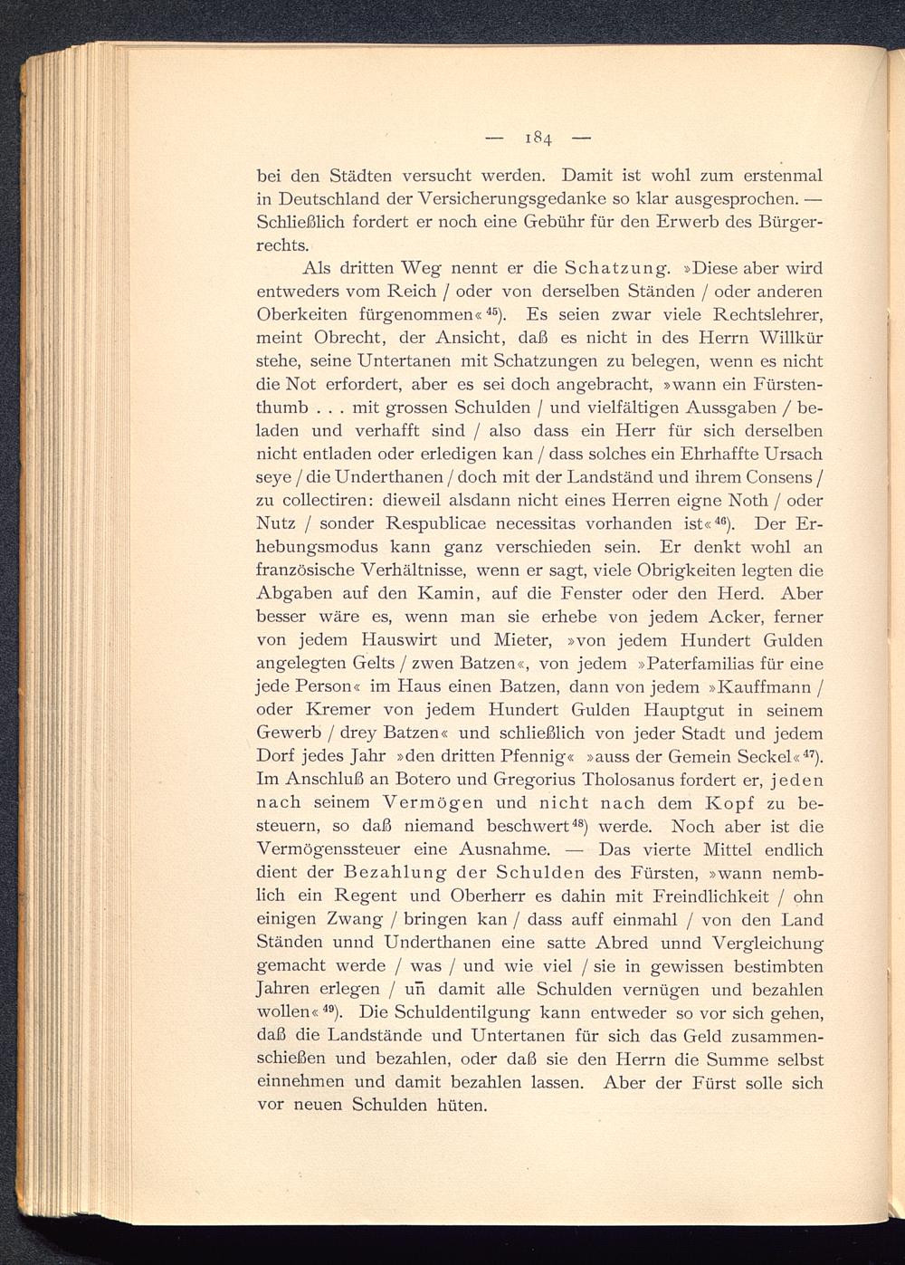 Als dritten Weg nennt er die Schatzung. »Diese aber wirdentweders vom Reich / oder von derselben Ständen / oder anderenOberkeiten fürgenommen« 45 ). Es seien zwar viele Rechtslehrer,meint Obrecht, der Ansicht, daß es nicht in des Herrn Willkürstehe, seine Untertanen mit Schatzungen zu belegen, wenn es nichtdie Not erfordert, aber es sei doch angebracht, »wann ein Fürsten-thumb . . . mit grossen Schulden / und vielfältigen Aussgaben / be-laden und verhafft sind / also dass ein Herr für sich derselbennicht entladen oder erledigen kan / dass solches ein Ehrhaffte Ursachseye / die Underthanen / doch mit der Landständ und ihrem Consens /zu collectiren: dieweil alsdann nicht eines Herren eigne Noth / oderNutz / sonder Respublicae necessitas vorhanden ist« 46 ). Der Er-hebungsmodus kann ganz verschieden sein. Er denkt wohl anfranzösische Verhältnisse, wenn er sagt, viele Obrigkeiten legten dieAbgaben auf den Kamin, auf die Fenster oder den Herd. Aberbesser wäre es, wenn man sie erhebe von jedem Acker, fernervon jedem Hauswirt und Mieter, »von jedem Hundert Guldenangelegten Gelts / zwen Batzen«, von jedem »Paterfamilias für einejede Person« im Haus einen Batzen, dann von jedem »Kauffmann /oder Kremer von jedem Hundert Gulden Hauptgut in seinemGewerb / drey Batzen« und schließlich von jeder Stadt und jedemDorf jedes Jahr »den dritten Pfennig« »auss der Gemein Seckel« 47 ).Im Anschluß an Botero und Gregorius Tholosanus fordert er, jedennach seinem Vermögen und nicht nach dem Kopf zu be-steuern, so daß niemand beschwert 48 ) werde. Noch aber ist dieVermögenssteuer eine Ausnahme. — Das vierte Mittel endlichdient der Bezahlung der Schulden des Fürsten , »wann nemb-lich ein Regent und Oberherr es dahin mit Freindlichkeit / ohneinigen Zwang / bringen kan / dass auff einmahl / von den LandStänden unnd Underthanen eine satte Abred unnd Vergleichunggemacht werde / was / und wie viel / sie in gewissen bestimbtenJahren erlegen / uh damit alle Schulden vernügen und bezahlenwollen« 49 ). Die Schuldentilgung kann entweder so vor sich gehen,daß die Landstände und Untertanen für sich das Geld zusammen-schießen und bezahlen, oder daß sie den Herrn die Summe selbsteinnehmen und damit bezahlen lassen. Aber der Fürst solle sichvor neuen Schulden hüten.