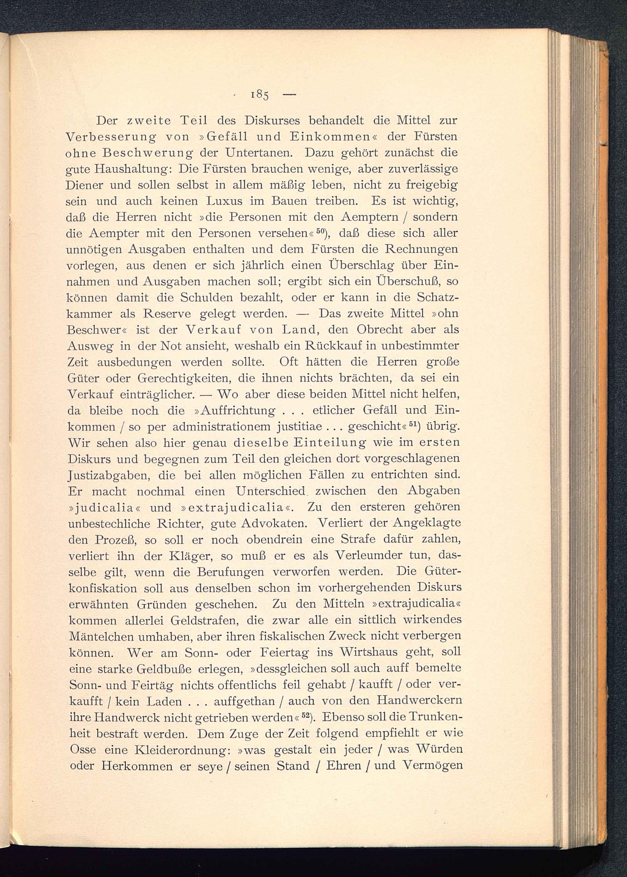 Der zweite Teil des Diskurses behandelt die Mittel zurVerbesserung von »Gefäll und Einkommen« der Fürsten ohne Beschwerung der Untertanen. Dazu gehört zunächst diegute Haushaltung: Die Fürsten brauchen wenige, aber zuverlässigeDiener und sollen selbst in allem mäßig leben, nicht zu freigebigsein und auch keinen Luxus im Bauen treiben. Es ist wichtig,daß die Herren nicht »die Personen mit den Aemptern / sonderndie Aempter mit den Personen versehen« 50 ), daß diese sich allerunnötigen Ausgaben enthalten und dem Fürsten die Rechnungenvorlegen, aus denen er sich jährlich einen Überschlag über Ein-nahmen und Ausgaben machen soll; ergibt sich ein Überschuß, sokönnen damit die Schulden bezahlt, oder er kann in die Schatz-kammer als Reserve gelegt werden. — Das zweite Mittel »ohnBeschwer« ist der Verkauf von Land, den Obrecht aber alsAusweg in der Not ansieht, weshalb ein Rückkauf in unbestimmterZeit ausbedungen werden sollte. Oft hätten die Herren großeGüter oder Gerechtigkeiten, die ihnen nichts brächten, da sei einVerkauf einträglicher. — Wo aber diese beiden Mittel nicht helfen,da bleibe noch die »Auffrichtung . . . etlicher Gefäll und Ein-kommen / so per administrationem justitiae . . . geschieht« 61 ) übrig.Wir sehen also hier genau dieselbe Einteilung wie im erstenDiskurs und begegnen zum Teil den gleichen dort vorgeschlagenenJustizabgaben, die bei allen möglichen Fällen zu entrichten sind.Er macht nochmal einen Unterschied zwischen den Abgaben»judicalia« und »extrajudicalia«. Zu den ersteren gehörenunbestechliche Richter, gute Advokaten. Verliert der Angeklagteden Prozeß, so soll er noch obendrein eine Strafe dafür zahlen,verliert ihn der Kläger , so muß er es als Verleumder tun, das-selbe gilt, wenn die Berufungen verworfen werden. Die Güter-konfiskation soll aus denselben schon im vorhergehenden Diskurserwähnten Gründen geschehen. Zu den Mitteln »extrajudicalia«kommen allerlei Geldstrafen, die zwar alle ein sittlich wirkendesMäntelchen umhaben, aber ihren fiskalischen Zweck nicht verbergenkönnen. Wer am Sonn- oder Feiertag ins Wirtshaus geht, solleine starke Geldbuße erlegen, »dessgleichen soll auch auff bemelteSonn- und Feirtäg nichts offentlichs feil gehabt / kauf ft / oder ver-kauft / kein Laden . . . auffgethan / auch von den Handwerclcernihre Iiandwerck nicht getrieben werden« 52 ). Ebenso soll die Trunken-heit bestraft werden. Dem Zuge der Zeit folgend empfiehlt er wieOsse eine Kleiderordnung: »was gestalt ein jeder / was Würdenoder Herkommen er seye / seinen Stand / Ehren / und Vermögen