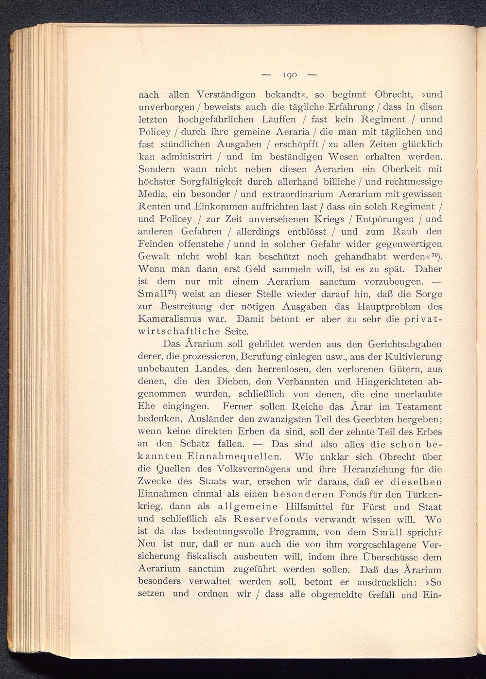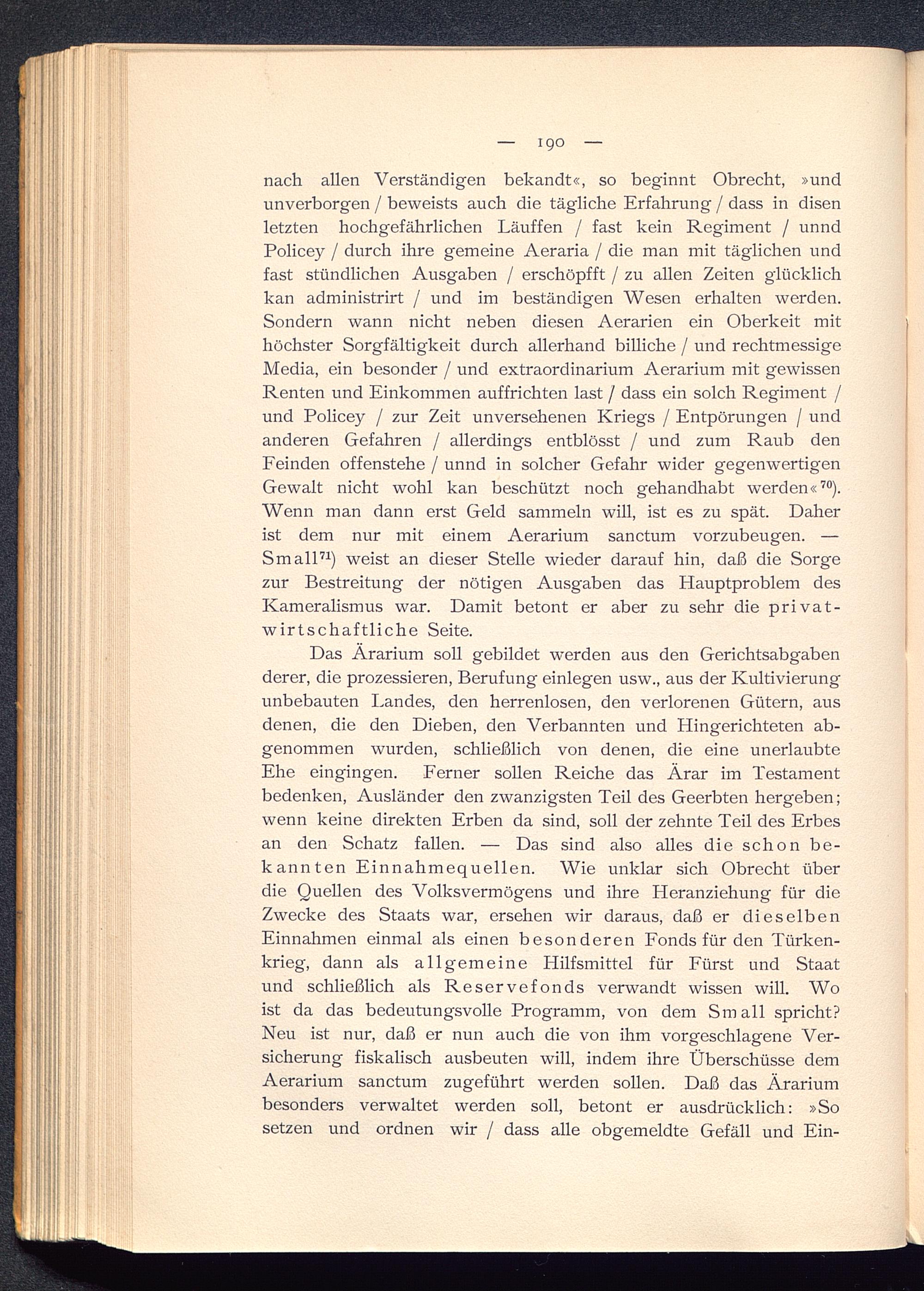 nach allen Verständigen bekandt«, so beginnt Obrecht, »undunverborgen / beweists auch die tägliche Erfahrung / dass in disenletzten hochgefährlichen Läuffen / fast kein Regiment / unndPolicey / durch ihre gemeine Aeraria / die man mit täglichen undfast stündlichen Ausgaben / erschöpfft / zu allen Zeiten glücklichkan administrirt / und im beständigen Wesen erhalten werden.Sondern wann nicht neben diesen Aerarien ein Oberkeit mithöchster Sorgfältigkeit durch allerhand billiche / und rechtmessigeMedia, ein besonder / und extraordinarium Aerarium mit gewissenRenten und Einkommen auffrichten last / dass ein solch Regiment /und Policey / zur Zeit unversehenen Kriegs / Entpörungen / undanderen Gefahren / allerdings entblösst / und zum Raub denFeinden offenstehe / unnd in solcher Gefahr wider gegenwertigenGewalt nicht wohl kan beschützt noch gehandhabt werden« 70 ).Wenn man dann erst Geld sammeln will, ist es zu spät. Daherist dem nur mit einem Aerarium sanctum vorzubeugen. —Small 71 ) weist an dieser Stelle wieder darauf hin, daß die Sorgezur Bestreitung der nötigen Ausgaben das Hauptproblem desKameralismus war. Damit betont er aber zu sehr die privat-wirtschaftliche Seite.