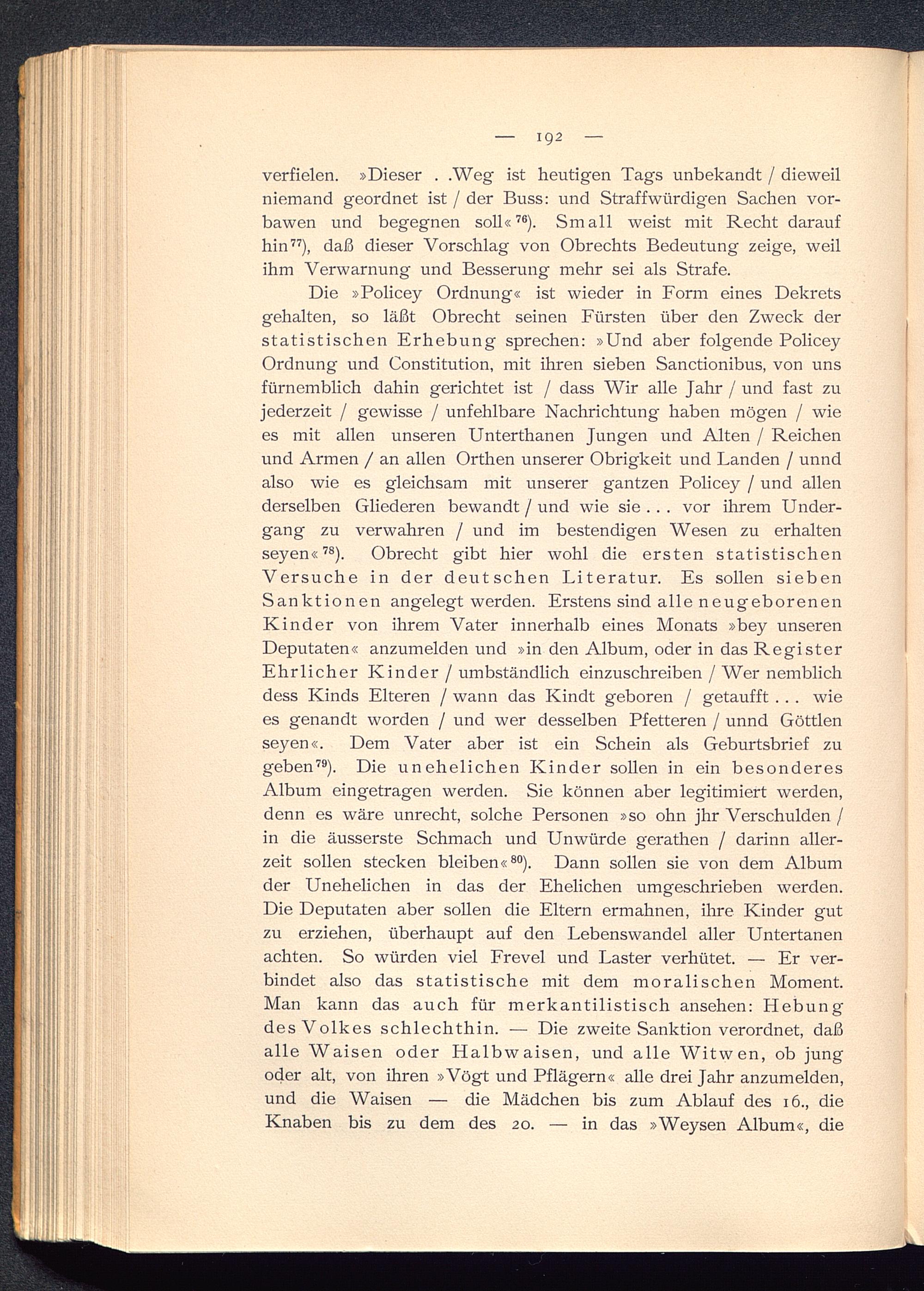 Die »Policey Ordnung« ist wieder in Form eines Dekretsgehalten, so läßt Obrecht seinen Fürsten über den Zweck derstatistischen Erhebung sprechen: »Und aber folgende PoliceyOrdnung und Constitution, mit ihren sieben Sanctionibus, von unsfürnemblich dahin gerichtet ist / dass Wir alle Jahr / und fast zujederzeit / gewisse / unfehlbare Nachrichtung haben mögen / wiees mit allen unseren Unterthanen Jungen und Alten / Reichenund Armen / an allen Orthen unserer Obrigkeit und Landen / unndalso wie es gleichsam mit unserer gantzen Policey / und allenderselben Gliederen bewandt / und wie sie . . . vor ihrem Under-gang zu verwahren / und im bestendigen Wesen zu erhaltenseyen« 78 ). Obrecht gibt hier wohl die ersten statistischenVersuche in der deutschen Literatur. Es sollen siebenSanktionen angelegt werden. Erstens sind alle neugeborenenKinder von ihrem Vater innerhalb eines Monats »bey unserenDeputaten« anzumelden und »in den Album, oder in das RegisterEhrlicher Kinder / umbständlich einzuschreiben / Wer nemblichdess Kinds Eiteren / wann das Kindt geboren / getaufft . . . wiees genandt worden / und wer desselben Pfetteren / unnd Göttienseyen«. Dem Vater aber ist ein Schein als Geburtsbrief zugeben 79 ). Die unehelichen Kinder sollen in ein besonderesAlbum eingetragen werden. Sie können aber legitimiert werden,denn es wäre unrecht, solche Personen »so ohn jhr Verschulden /in die äusserste Schmach und Unwürde gerathen / darinn aller-zeit sollen stecken bleiben« 80 ). Dann sollen sie von dem Albumder Unehelichen in das der Ehelichen umgeschrieben werden.Die Deputaten aber sollen die Eltern ermahnen, ihre Kinder gutzu erziehen, überhaupt auf den Lebenswandel aller Untertanenachten. So würden viel Frevel und Laster verhütet. — Er ver-bindet also das statistische mit dem moralischen Moment.Man kann das auch für merkantilistisch ansehen: Hebungdes Volkes schlechthin. — Die zweite Sanktion verordnet, daßalle Waisen oder Halbwaisen, und alle Witwen, ob jungoder alt, von ihren »Vögt und Pflägern« alle drei Jahr anzumelden,und die Waisen — die Mädchen bis zum Ablauf des 16., dieKnaben bis zu dem des 20. — in das »Weysen Album«, die