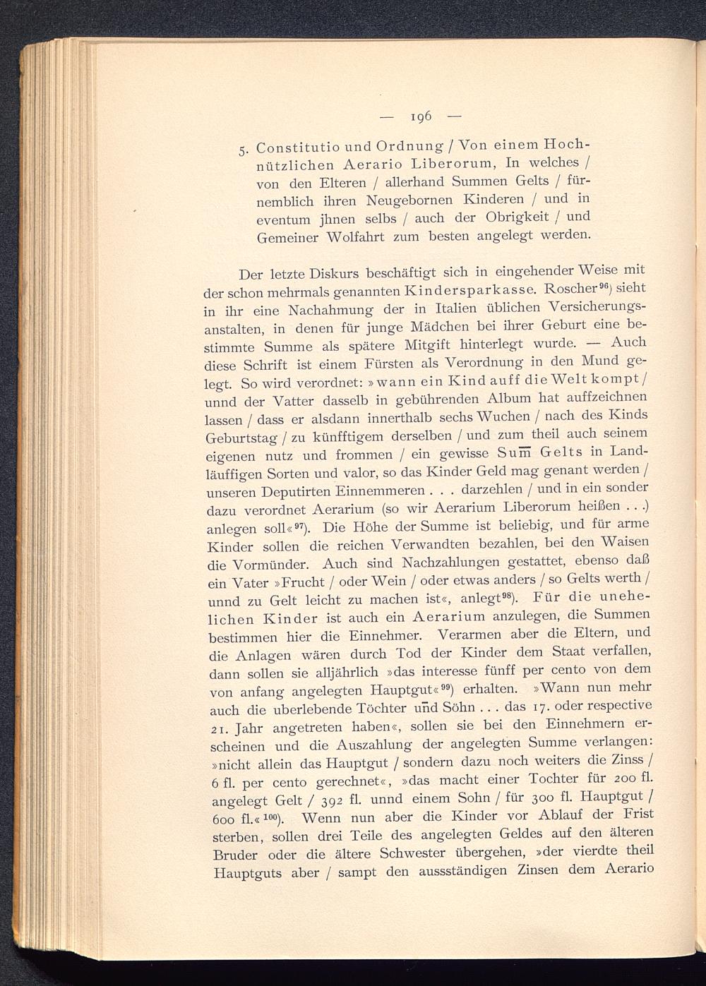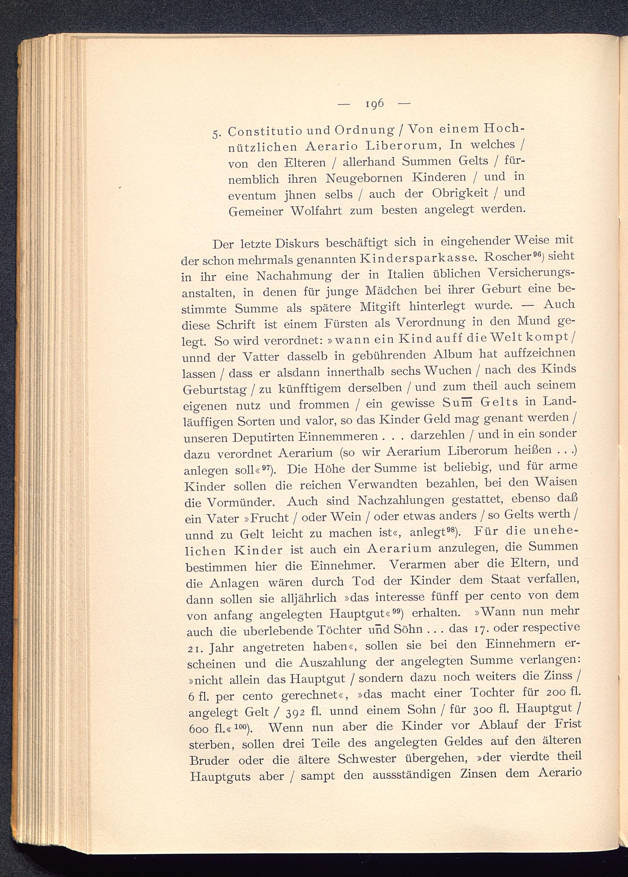 Der letzte Diskurs beschäftigt sich in eingehenderWeise mitder schon mehrmals genannten Kindersparkasse. Roscher 96 ) siehtin ihr eine Nachahmung der in Italien üblichen Versicherungs-anstalten, in denen für junge Mädchen bei ihrer Geburt eine be-stimmte Summe als spätere Mitgift hinterlegt wurde. — Auchdiese Schrift ist einem Fürsten als Verordnung in den Mund ge-legt. So wird verordnet: »wann ein Kind auf f die Welt kompt /unnd der Vatter dasselb in gebührenden Album hat auffzeichnenlassen / dass er alsdann innerthalb sechs Wuchen / nach des KindsGeburtstag / zu künfftigem derselben / und zum theil auch seinemeigenen nutz und frommen / ein gewisse Sum Gelts in Land-läufigen Sorten und valor, so das Kinder Geld mag genant werden /unseren Deputirten Einnemmeren . . . darzehlen / und in ein sonderdazu verordnet Aerarium (so wir Aerarium Liberorum heißen . . .)anlegen soll« 97 ). Die Höhe der Summe ist beliebig, und für armeKinder sollen die reichen Verwandten bezahlen, bei den Waisendie Vormünder. Auch sind Nachzahlungen gestattet, ebenso daßein Vater »Frucht / oder Wein / oder etwas anders / so Gelts werth /unnd zu Gelt leicht zu machen ist«, anlegt 98 ). Für die unehe-lichen Kinder ist auch ein Aerarium anzulegen, die Summenbestimmen hier die Einnehmer. Verarmen aber die Eltern, unddie Anlagen wären durch Tod der Kinder dem Staat verfallen,dann sollen sie alljährlich »das interesse fünff per cento von demvon anfang angelegten Hauptgut« 99 ) erhalten. »Wann nun mehrauch die überlebende Töchter und Söhn . . . das 17. oder respective21. Jahr angetreten haben«, sollen sie bei den Einnehmern er-scheinen und die Auszahlung der angelegten Summe verlangen:»nicht allein das Llauptgut / sondern dazu noch weiters die Zinss /6 fl. per cento gerechnet«, »das macht einer Tochter für 200 fl.angelegt Gelt / 392 fl. unnd einem Sohn / für 300 fl. Hauptgut /600 fl.« 10 °). Wenn nun aber die Kinder vor Ablauf der Friststerben, sollen drei Teile des angelegten Geldes auf den älterenBruder oder die ältere Schwester übergehen, »der vierdte theilHauptguts aber / sampt den aussständigen Zinsen dem Aerario