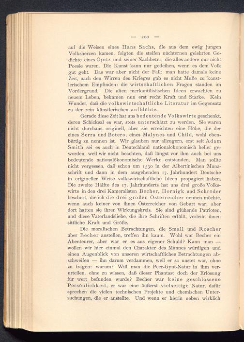 Gerade diese Zeit hat uns bedeutendeVolkswirte geschenkt,deren Schicksal es war, stets unterschätzt zu werden. Sie warennicht durchaus originell, aber sie erreichten eine Höhe, die dereines Serra und Botero, eines Malynes und Child, wohl eben-bürtig zu nennen ist. Wir glauben nur allzugern, erst seit AdamSmith sei es auch in Deutschland nationalökonomisch heller ge-worden, weil wir nicht beachten, daß längst vor ihm auch bei unsbedeutende nationalökonomische Werke entstanden. Man solltenicht vergessen, daß schon um 1530 in der Albertinischen Münz-schrift und dann in dem ausgehenden 17. Jahrhundert Deutsche in origineller Weise volkswirtschaftliche Ideen propagiert haben.Die zweite Hälfte des 17. Jahrhunderts hat uns drei große Volks-wirte in den drei Kameralisten Becher, Hornigk und Schröderbeschert, die ich die drei großen Österreicher nennen möchte,wenn auch keiner von ihnen Österreicher von Geburt war; aberdort hatten sie ihren Wirkungskreis. Sie sind glühende Patrioten,und diese Vaterlandsliebe, die ihre Schriften erfüllt, verleiht ihnensittliche Kraft und Größe.